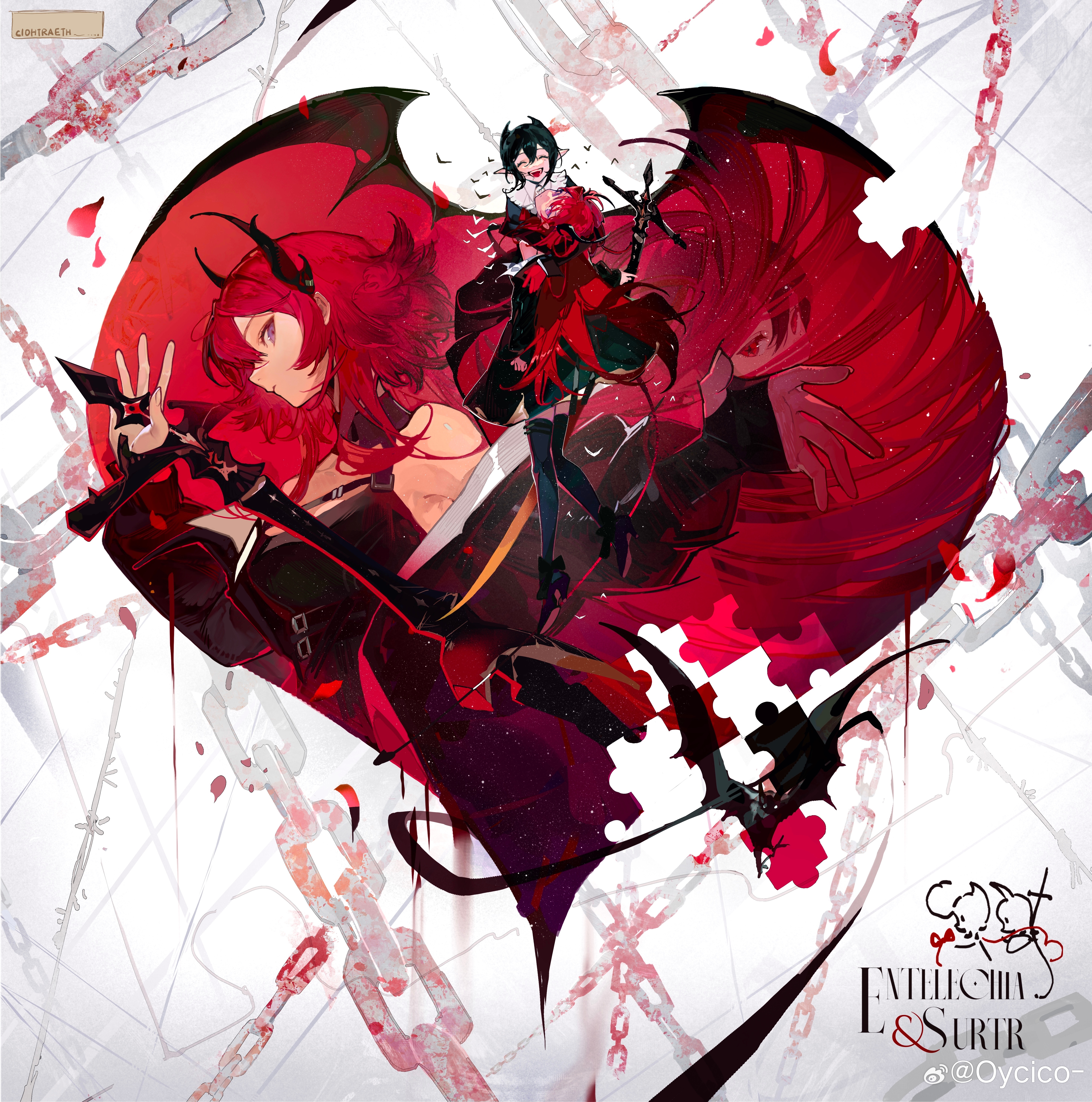 2girls absurdres arknights artist_name black_dress black_hair black_shoes black_thighhighs breasts chain character_name closed_eyes dress entelechia_(arknights) fingerless_gloves gloves heart high_heels highres looking_at_viewer medium_breasts multiple_girls pointy_ears puzzle_piece qinghejunzi red_eyes red_hair red_theme shoes short_hair short_hair_with_long_locks sidelocks smile surtr_(arknights) sword thighhighs weapon
