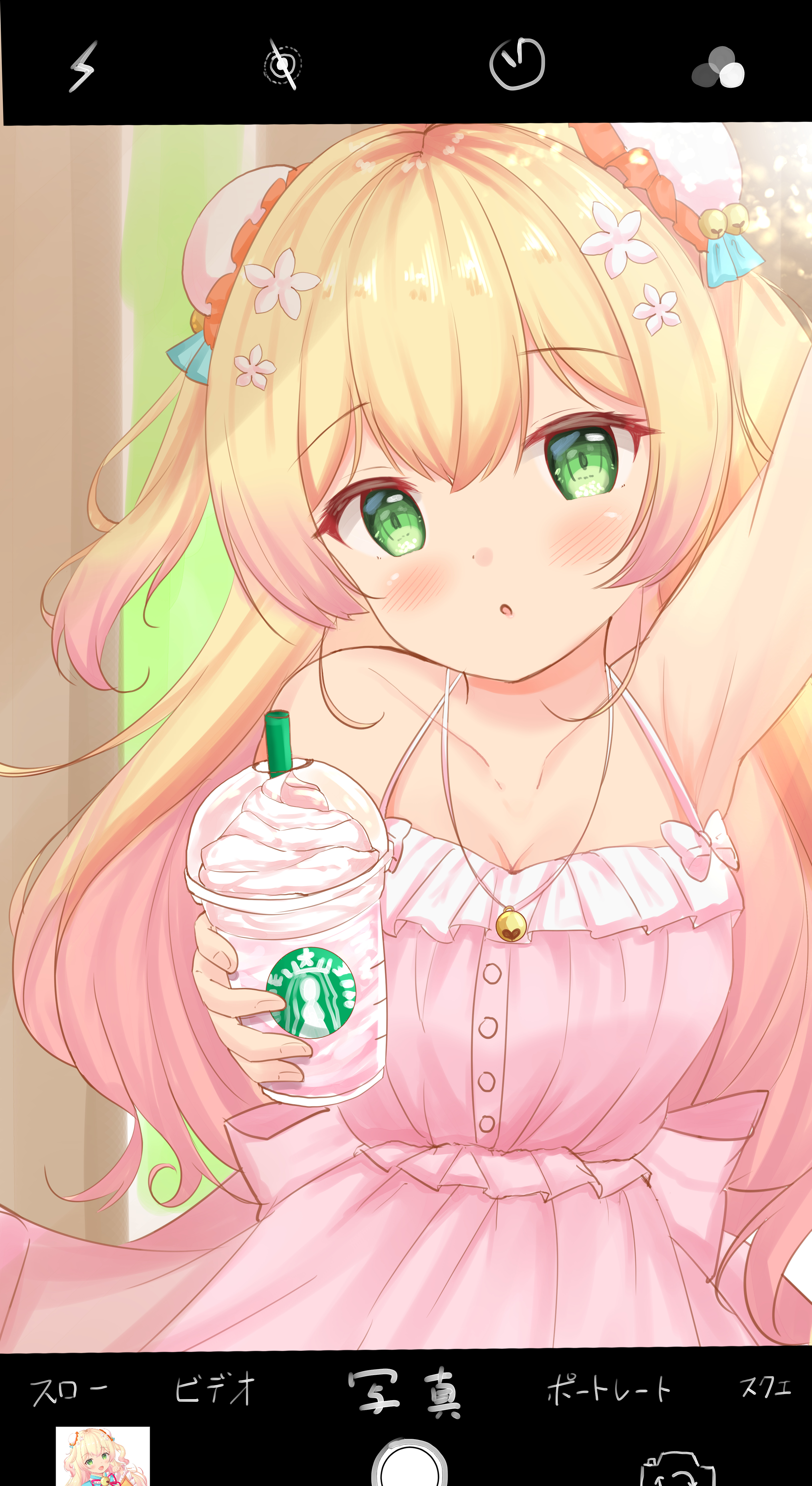 1girl absurdres alternate_costume blonde_hair blush cup disposable_cup double_bun dress drinking_straw fake_screenshot flower gradient_hair green_eyes hair_bun hair_flower hair_ornament highres holding holding_cup hololive kanti15 long_hair looking_at_viewer momosuzu_nene multicolored_hair pink_dress pink_hair solo starbucks very_long_hair virtual_youtuber