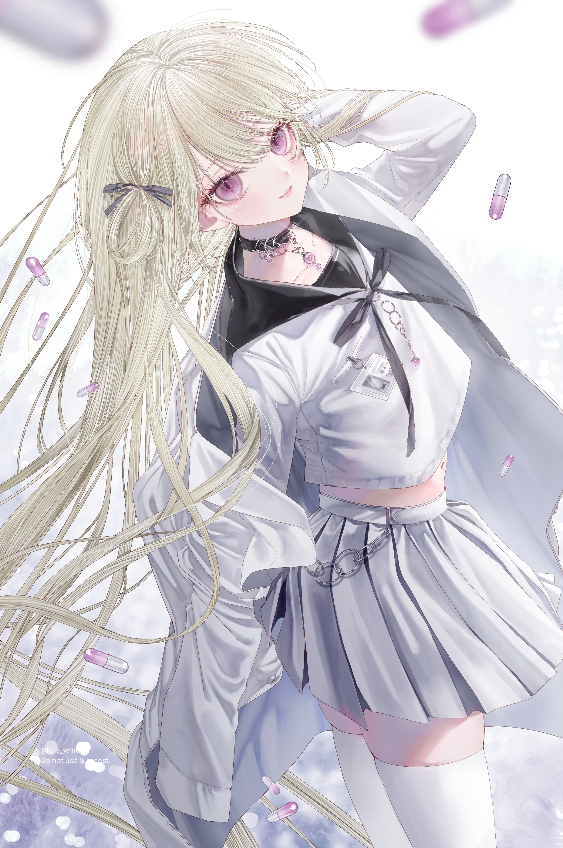 1girl absurdres black_sailor_collar blonde_hair blush choker flat_chest highres lab_coat long_hair looking_at_viewer msa_(fary_white) original phalaenopsis_(msa_(fary_white)) pill pleated_skirt purple_eyes sailor_collar school_uniform serafuku shirt skirt slit_pupils smile solo thighhighs very_long_hair white_thighhighs zettai_ryouiki