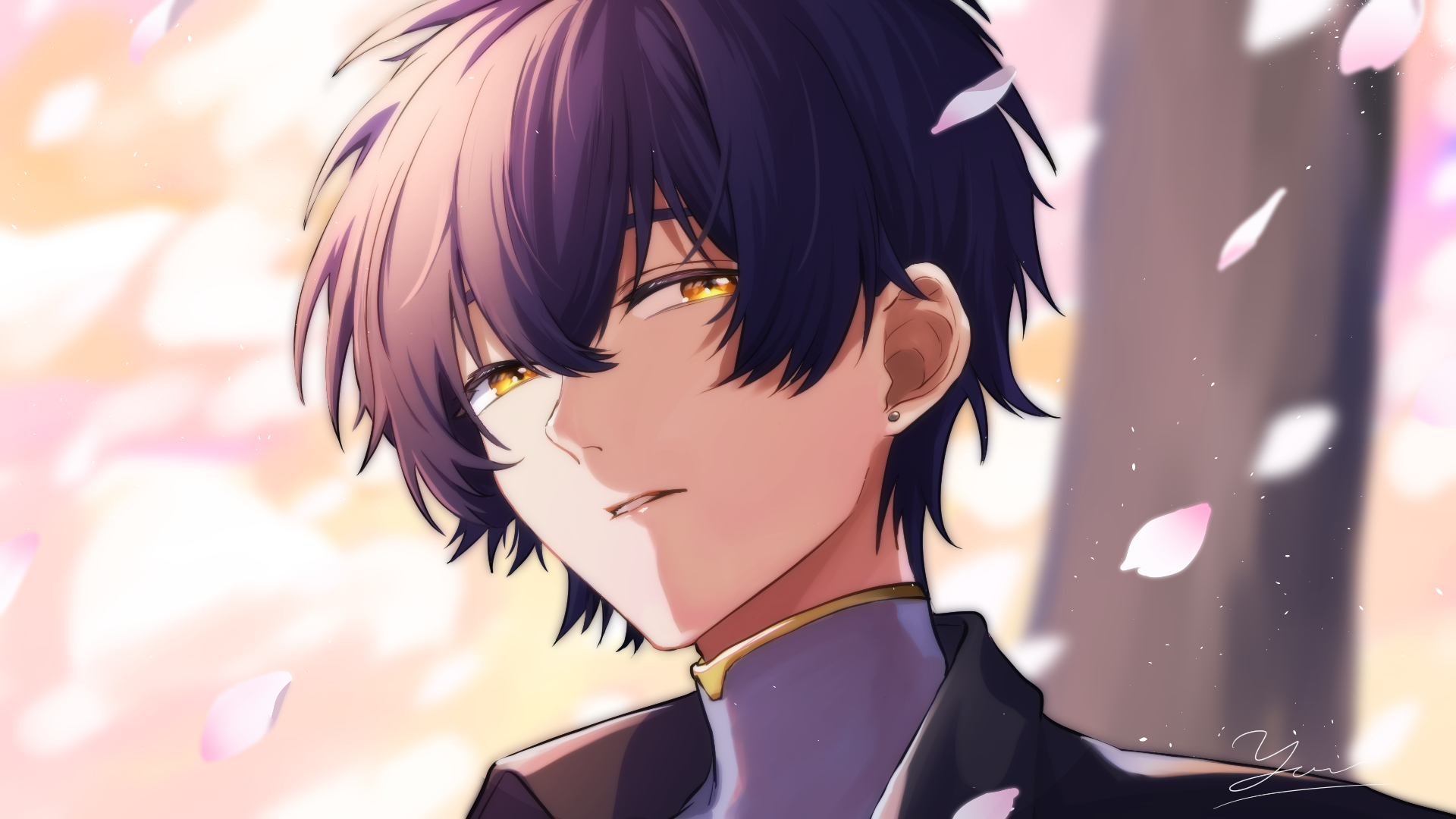 black_hair black_jacket cherry_blossoms cherry_tree commentary falling_petals grey_shirt highres jacket male_rover_(wuthering_waves) open_clothes open_jacket open_mouth petals rover_(wuthering_waves) shirt solo sunlight tree wuthering_waves yellow_eyes zea