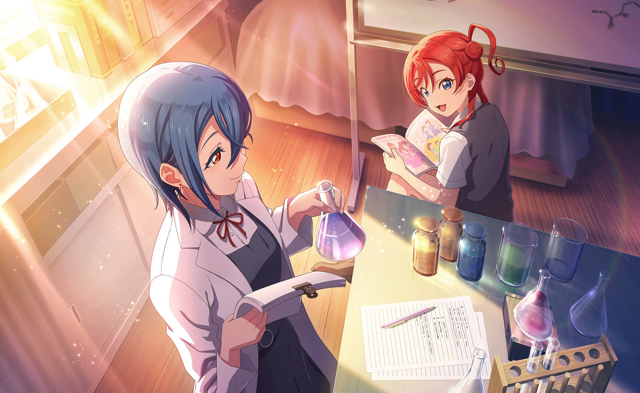 2girls beaker blue_eyes blue_hair blush book classroom closed_mouth coat collared_shirt cowboy_shot crossed_bangs curtains dress ear_piercing evening flask from_above game_cg grey_dress hair_between_eyes hair_bun hands_up highres holding holding_book holding_paper indoors jar lab_coat laboratory lens_flare light_particles light_rays liquid long_sleeves looking_at_another looking_to_the_side love_live! love_live!_school_idol_festival_2 love_live!_superstar!! multiple_girls neck_ribbon official_art open_book open_mouth orange_eyes paper paper_stack pen piercing pinafore_dress profile red_hair red_ribbon ribbon school_uniform shelf shirt short_hair short_sleeves single_side_bun sitting sleeveless sleeveless_dress smile standing string_tie summer_uniform sunbeam sunlight test_tube test_tube_rack wakana_shiki white_coat white_shirt whiteboard window yoneme_mei yuigaoka_school_uniform