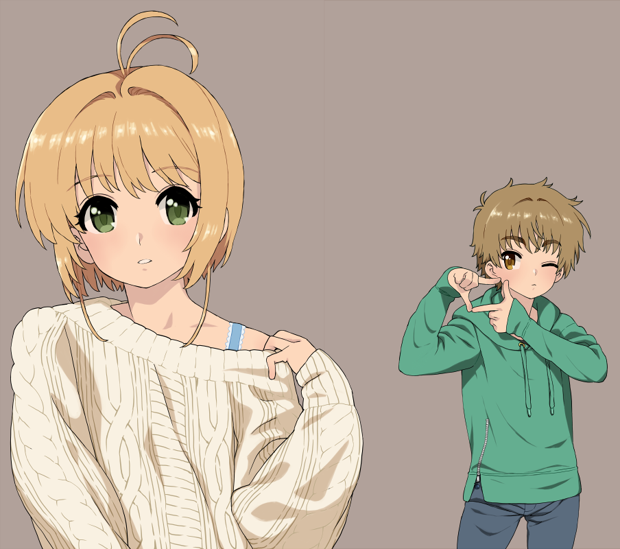 1boy 1girl antenna_hair blonde_hair blush brown_eyes brown_hair cardcaptor_sakura commentary_request expressionless finger_frame green_eyes grey_background hood hoodie kinomoto_sakura li_syaoran looking_at_viewer one_eye_closed parted_lips ribbed_sweater short_hair simple_background sweater wakaho_riku