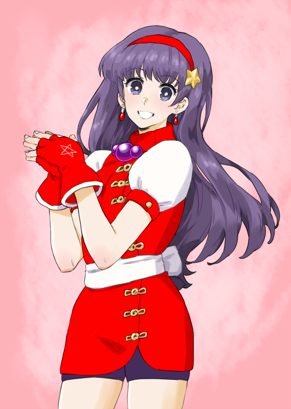 1girl aona_240 asamiya_athena bike_shorts commentary_request earrings fingerless_gloves gloves hairband jewelry long_hair looking_at_viewer purple_eyes purple_hair red_hairband smile solo the_king_of_fighters the_king_of_fighters_'98 wakaho_riku