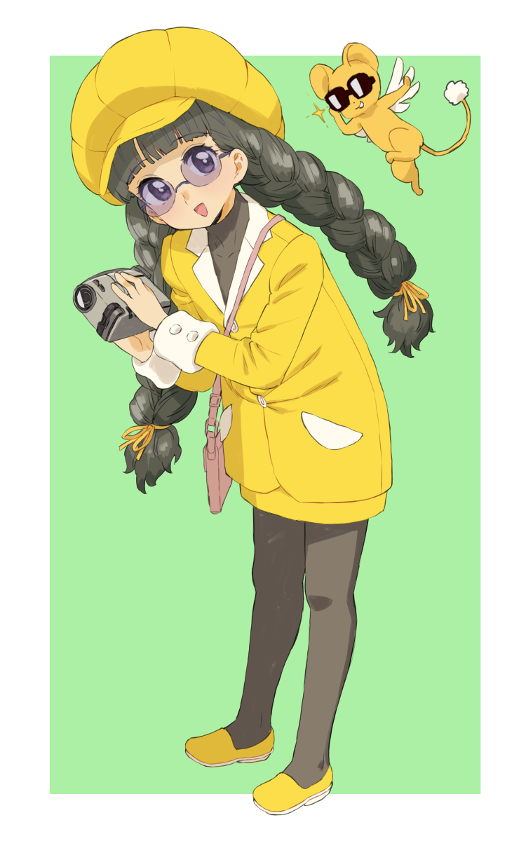 1girl bag cardcaptor_sakura commentary_request daidouji_tomoyo full_body glasses highres holding kero_(cardcaptor_sakura) open_mouth shoes sunglasses tail video_camera wakaho_riku wings yellow_shoes