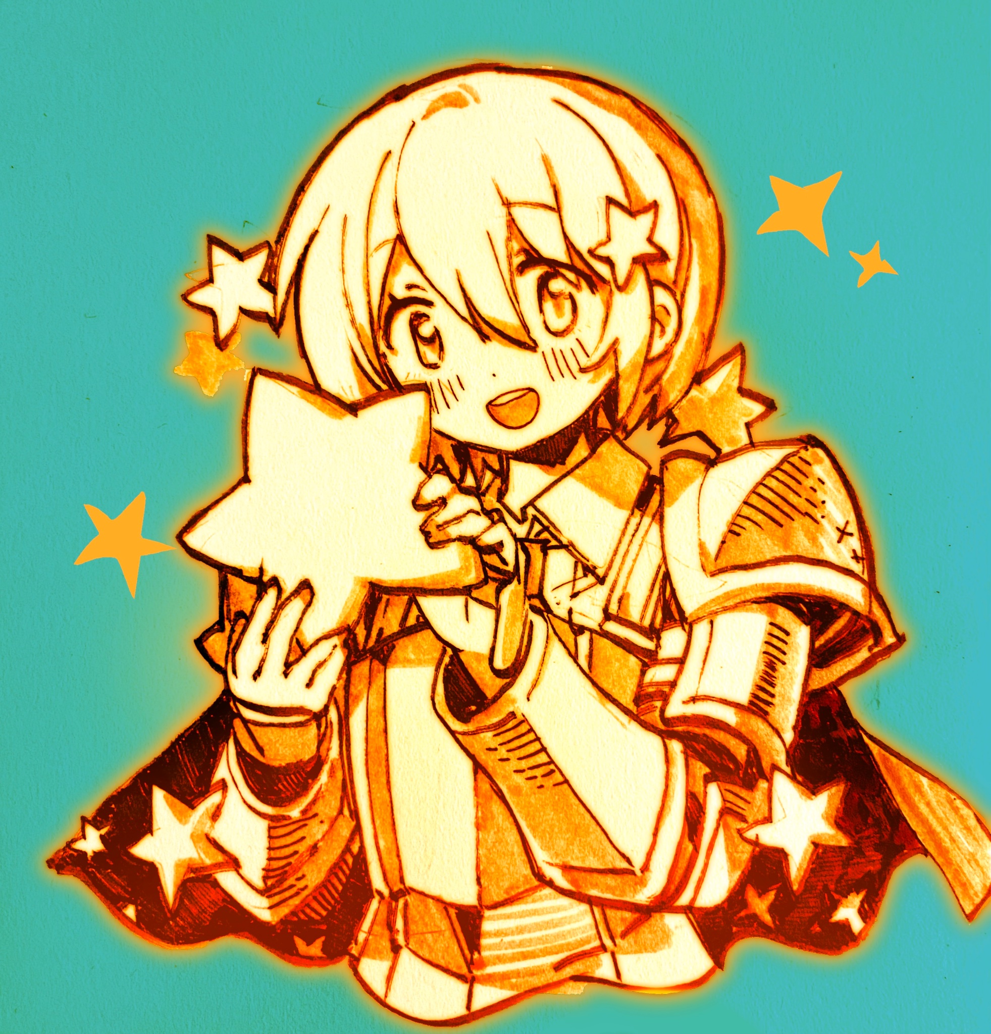 1girl :d aqua_background armor blush bob_cut cape collared_shirt commentary don_quixote_(project_moon) e.g.o_(project_moon) hair_between_eyes hair_ornament highres holding holding_star kampuzu la_sangre_de_sancho_(e.g.o) limbus_company looking_at_viewer open_mouth project_moon sepia shirt shoulder_armor smile solo star_(symbol) star_hair_ornament teeth upper_body upper_teeth_only