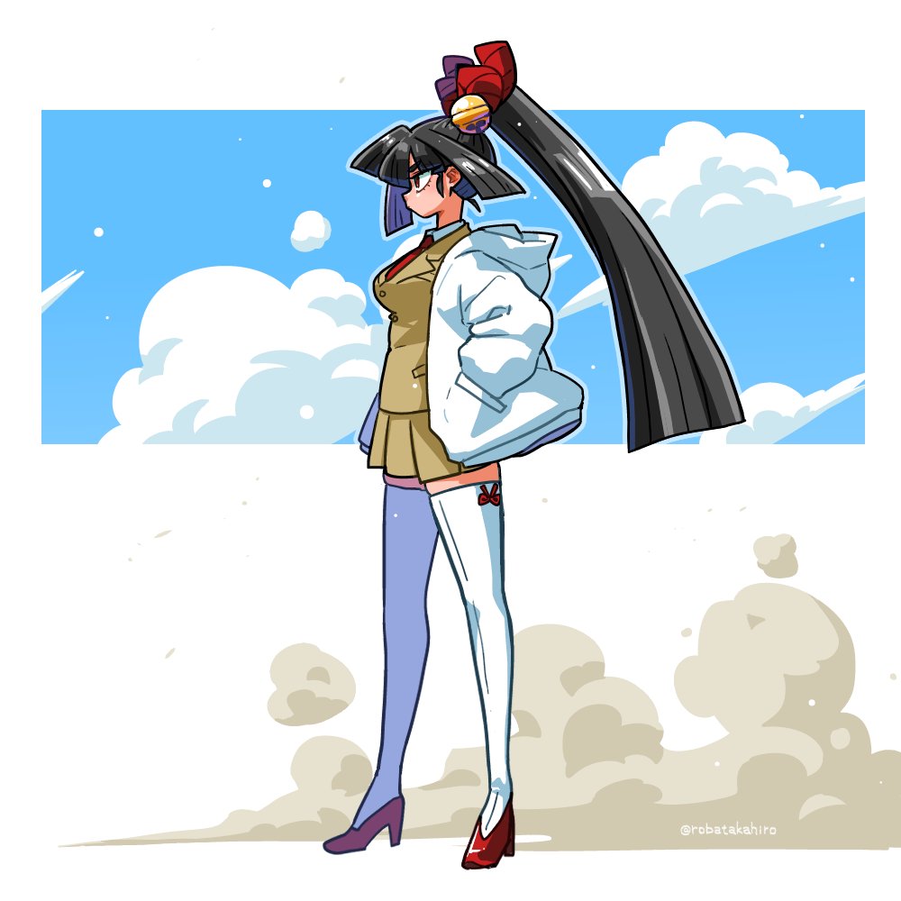 1girl artist_name bell black_hair breasts brown_jacket brown_skirt from_side hair_bell hair_ornament hands_in_pockets high_heels high_ponytail igami_ichika jacket jingle_bell long_hair looking_to_the_side miniskirt pleated_skirt ponytail skirt solo standing susume!_ashitabara_gakuen thighhighs wanta_(futoshi) white_jacket white_thighhighs zettai_ryouiki