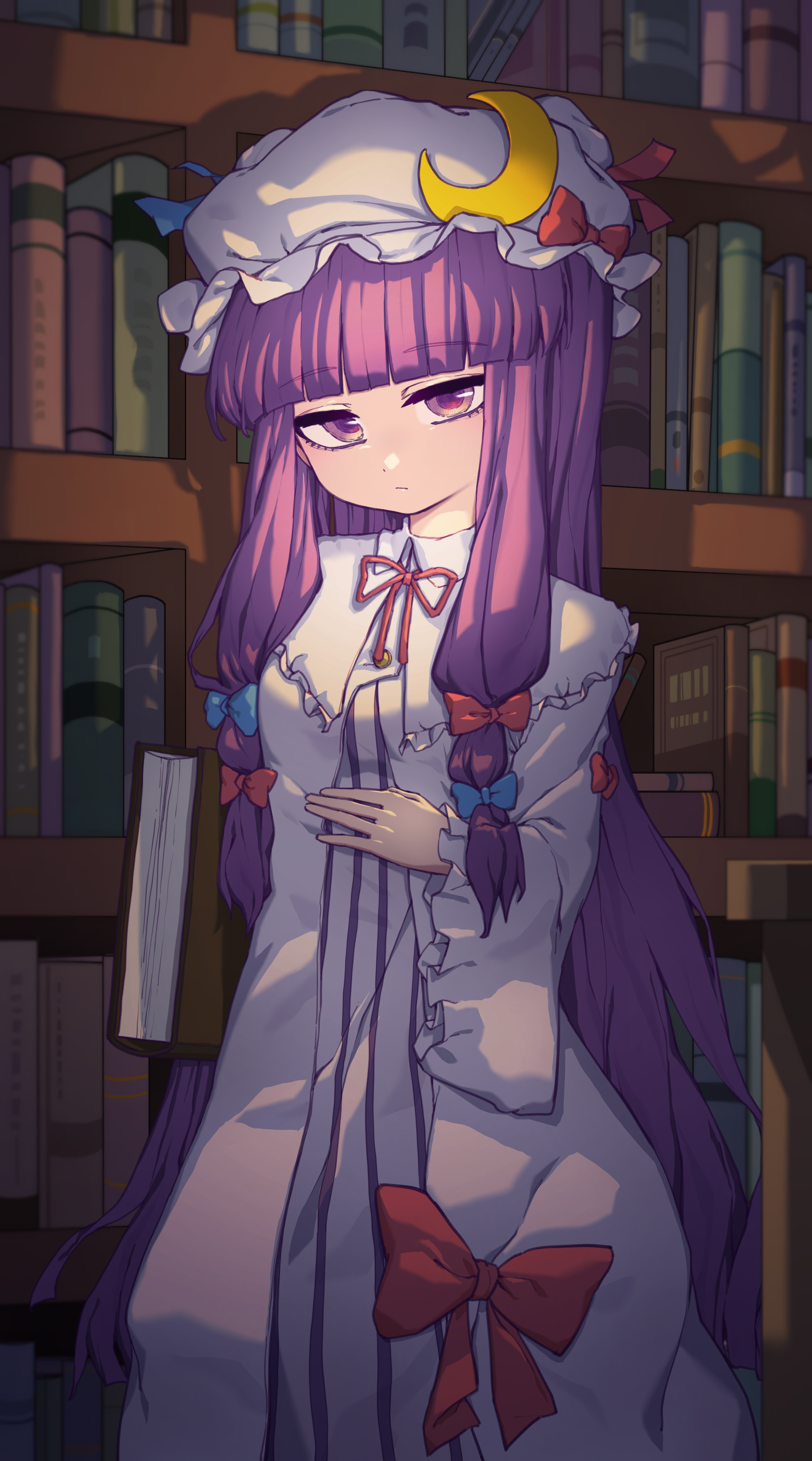 1girl absurdres blue_bow book bow cowboy_shot dress hat highres holding holding_book library long_hair long_sidelocks looking_at_viewer mob_cap moon_(ornament) patchouli_knowledge purple_eyes red_bow red_ribbon ribbon sidelocks solo striped_clothes striped_dress touhou vertical-striped_clothes vertical-striped_dress very_long_hair white_dress white_hat wide_sleeves yinhe_yan