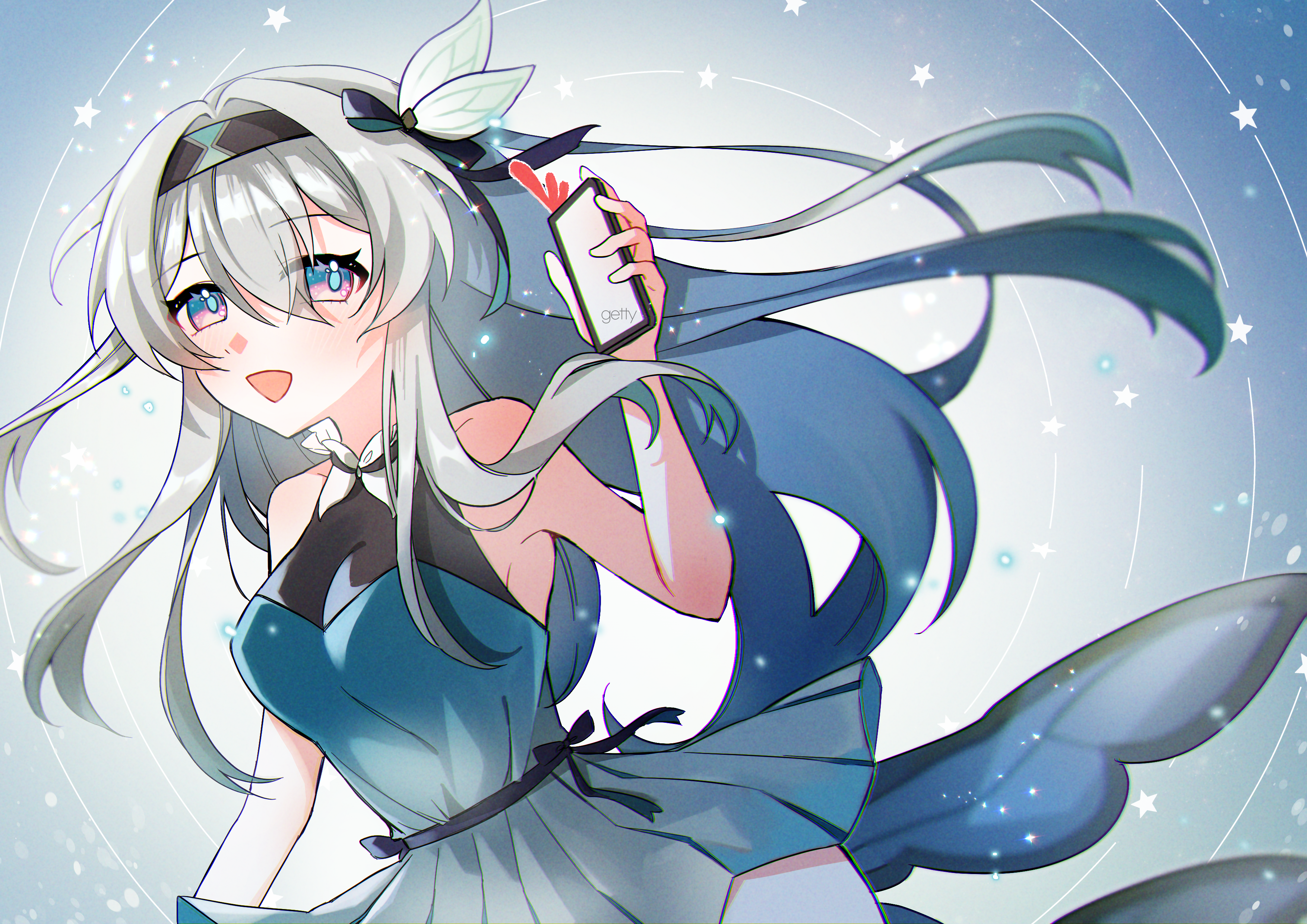 1girl absurdres aqua_dress artist_name bare_shoulders black_hairband blue_eyes blue_pupils dress feather_hair_ornament feathers firefly_(honkai:_star_rail) getty-gy grey_hair hair_ornament hairband highres holding holding_phone honkai:_star_rail honkai_(series) long_hair looking_at_viewer multicolored_eyes phone pink_eyes sleeveless sleeveless_dress solo two-tone_eyes