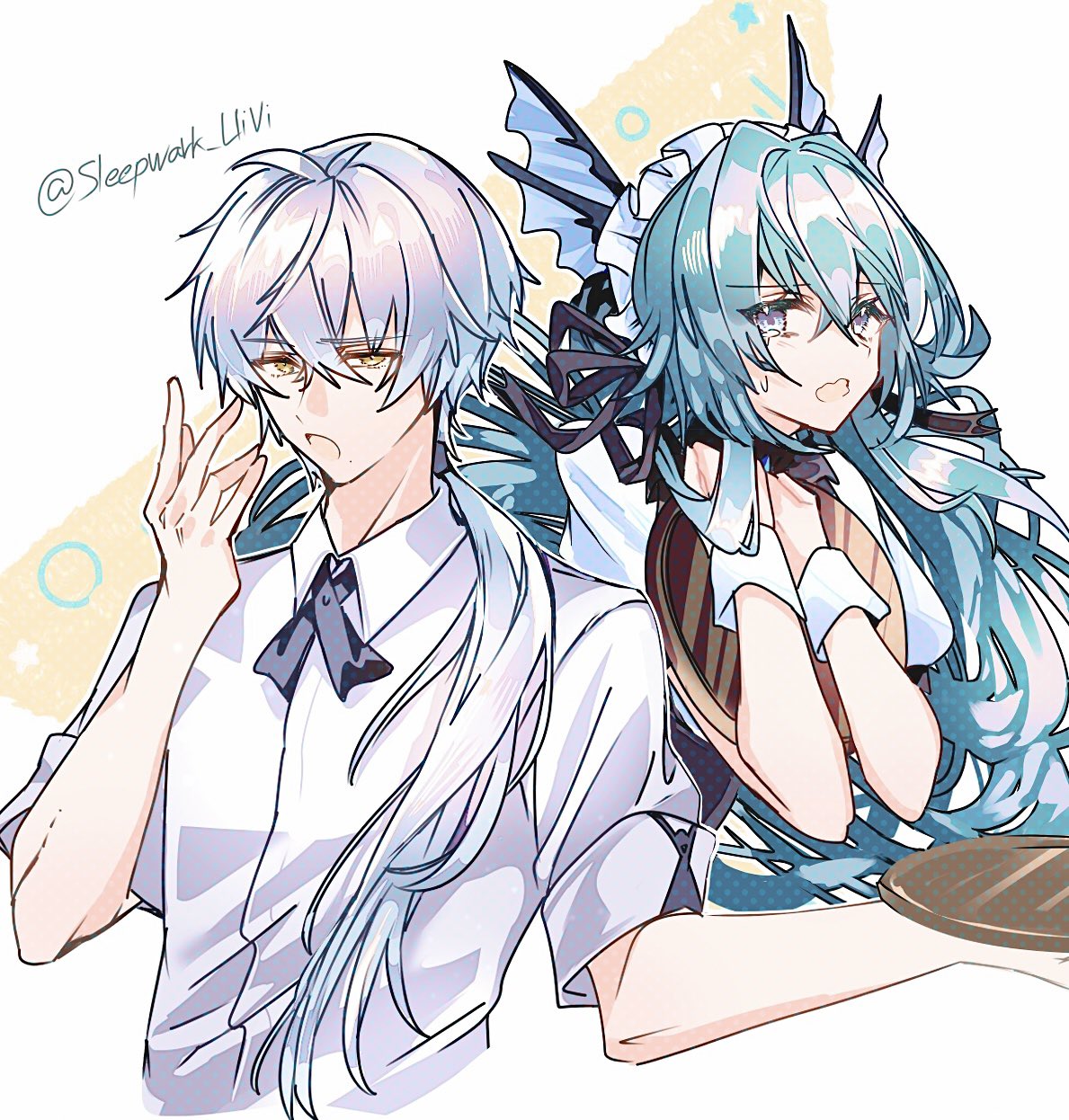 1boy 1girl blonde_hair blue_eyes butler character_request check_character collared_shirt crossed_bangs fins grey_hair hair_between_eyes hair_intakes head_fins highres lamia:_lost_lullaby_(pgr) lamia_(pgr) long_hair maid maid_headdress ponytail punishing:_gray_raven roland_(pgr) shirt sidelocks sleepwark_llivi sweatdrop twitter_username very_long_hair white_hair yawning yellow_eyes