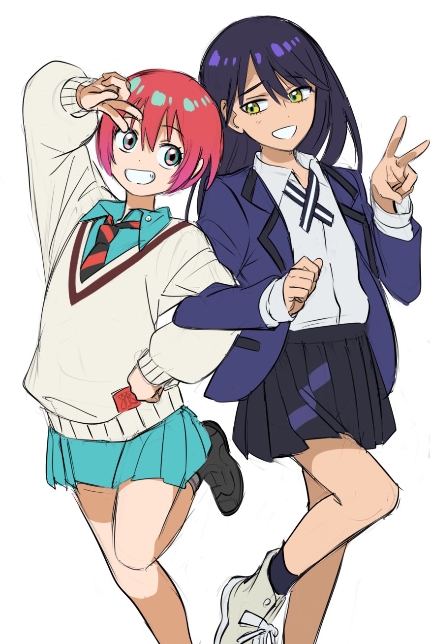 2girls :d amate_yuzuriha aqua_shirt arm_up black_hair black_necktie black_skirt blue_jacket commentary cowboy_shot diagonal-striped_clothes diagonal-striped_necktie furrowed_brow grin gundam gundam_gquuuuuux highres jacket lapels locked_arms long_hair long_sleeves looking_at_another multiple_girls necktie notched_lapels nyaan_(gundam_gquuuuuux) open_mouth pleated_skirt poteke red_hair red_necktie shirt short_hair simple_background skirt smile standing standing_on_one_leg striped_clothes sweater thighs unfinished v v_over_head white_background white_mouth white_shirt white_sweater