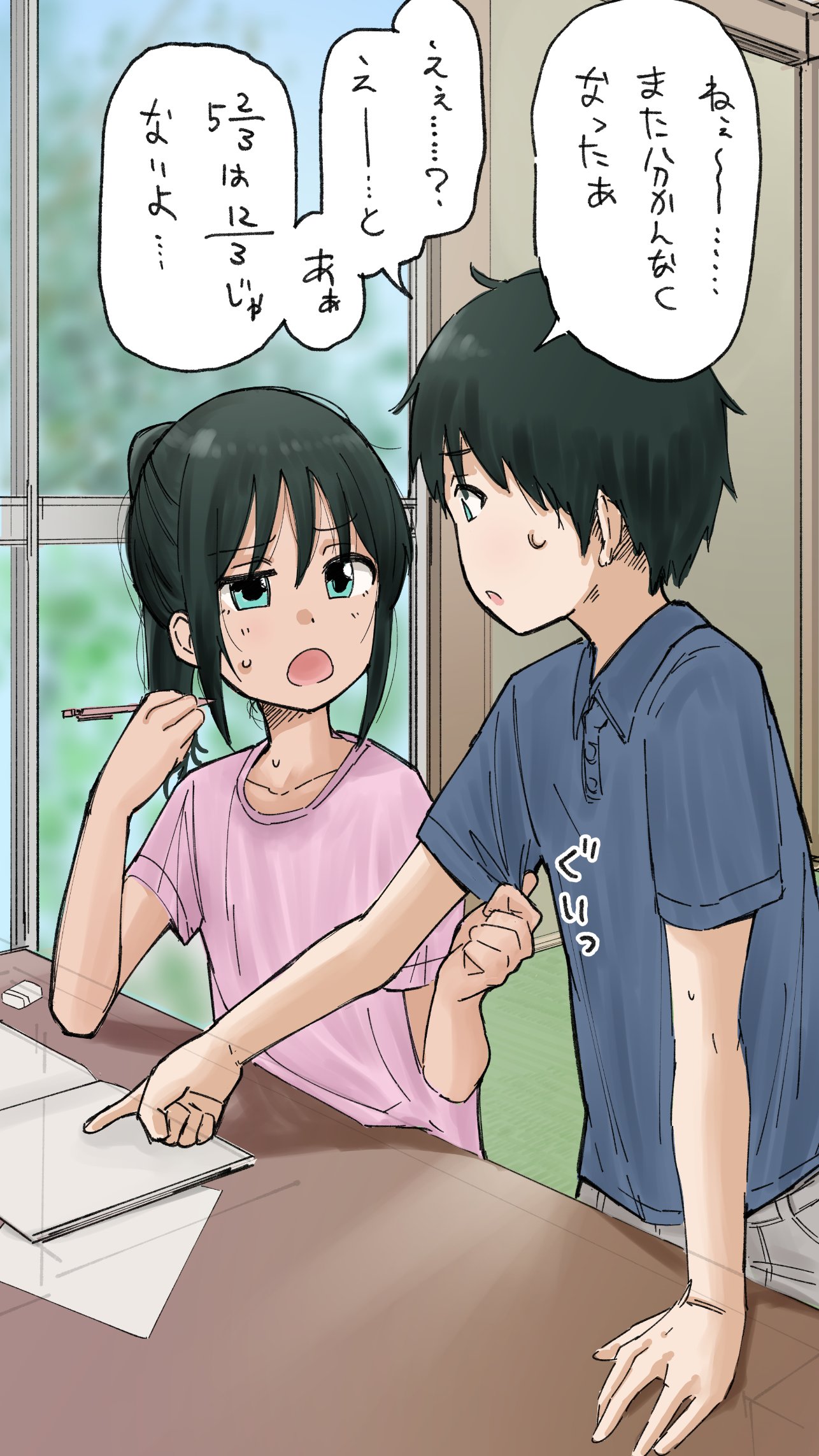 1boy 1girl :o black_hair blue_shirt collarbone commentary_request day eraser eye_contact green_eyes highres indoors inu_chikushou itoko_no_ko khaki_pants looking_at_another mechanical_pencil notebook nozomu_(itoko_no_ko) pencil pink_shirt pointing pointing_at_object polo_shirt raised_eyebrow shirt shirt_tug sou_(itoko_no_ko) sweat t-shirt table tan translation_request tree upper_body window
