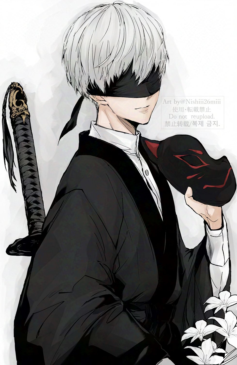 1boy 9s_(nier:automata) artist_name black_hairband black_kimono blindfold commentary_request covered_eyes hairband highres japanese_clothes katana kimono male_focus mole mole_under_mouth nier:automata nier_(series) nishiii26miii signature solo sword weapon white_hair