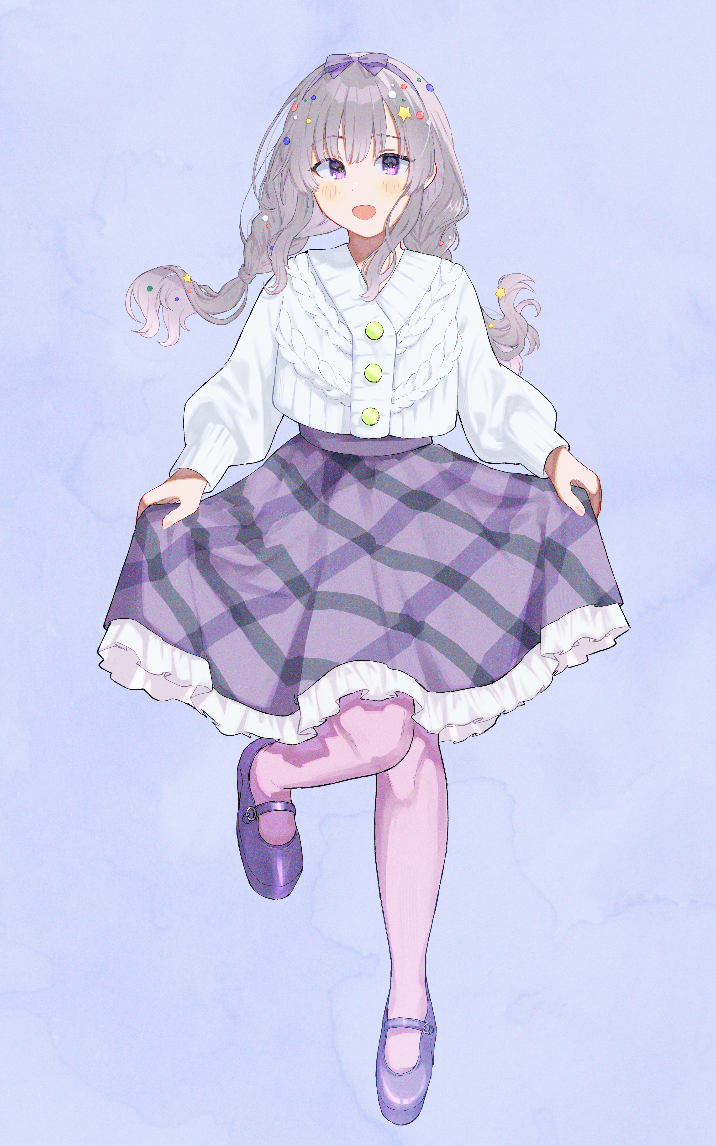 1girl 965ma_mogumogu absurdres blue_background blunt_bangs border bow braid buttons cable_knit cardigan commentary dot_nose eyelashes foot_up frilled_skirt frills full_body grey_hair hair_ribbon hairband highres holding_own_skirt idolmaster idolmaster_shiny_colors light_blush long_hair long_sleeves looking_at_viewer low_twin_braids mary_janes open_mouth pantyhose pink_pantyhose purple_bow purple_eyes purple_hairband purple_pantyhose purple_skirt ribbon shoes simple_background skirt smile solo twin_braids white_cardigan yukoku_kiriko