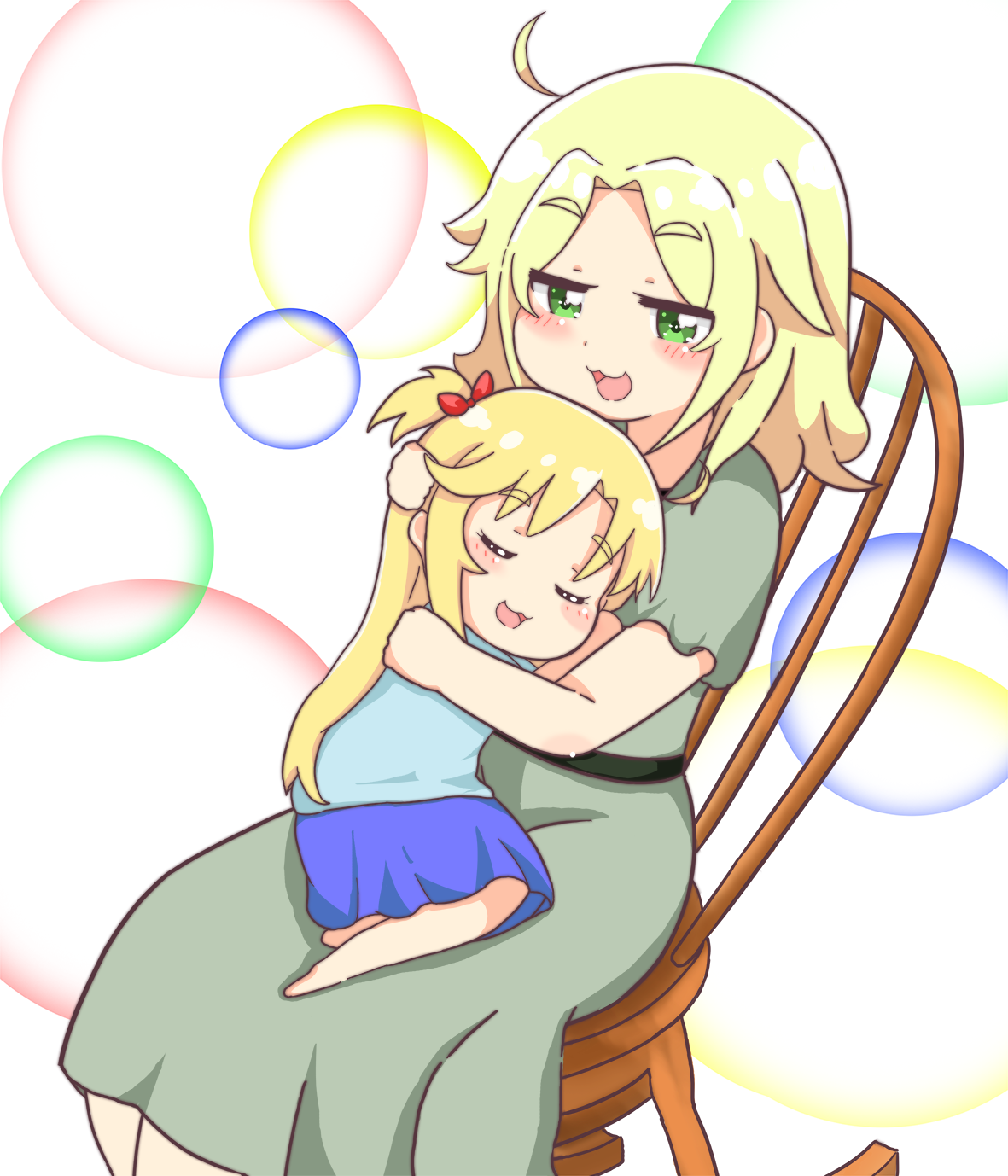 2girls blonde_hair blue_skirt dress green_dress green_eyes highres himesaka_emily himesaka_noa mother_and_child mother_and_daughter multiple_girls parent_and_child skirt watashi_ni_tenshi_ga_maiorita!