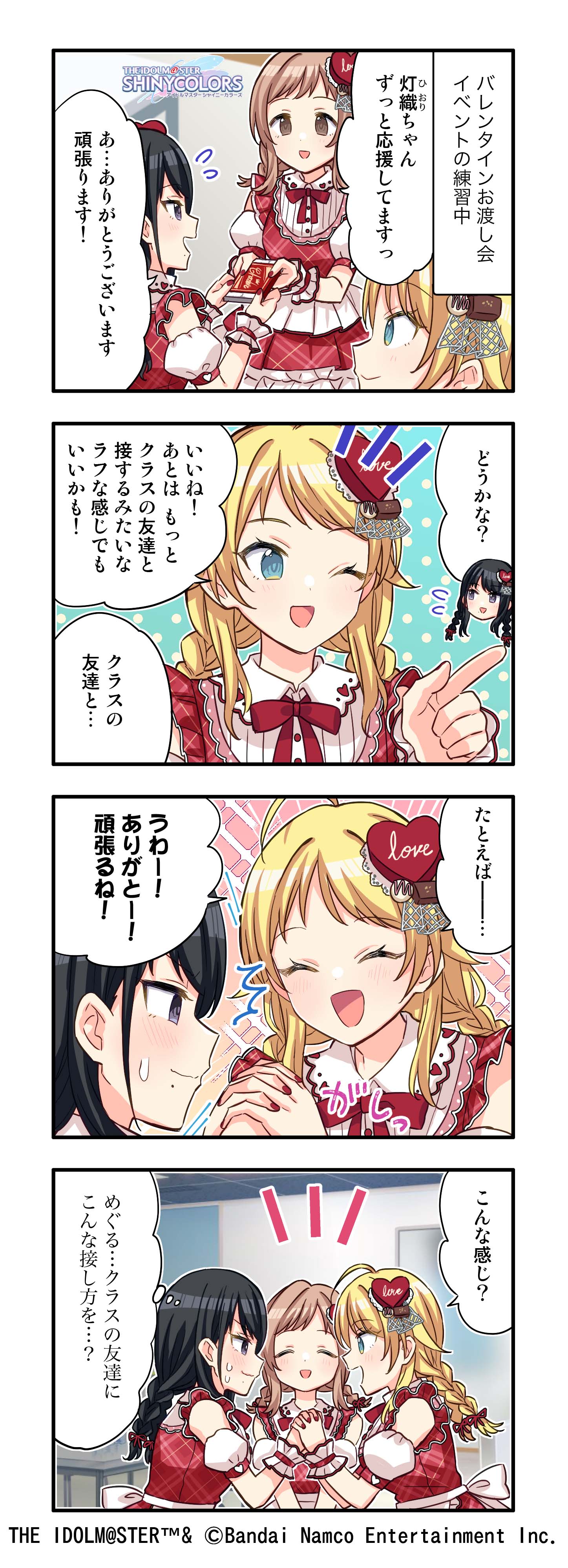 4koma absurdres armlet black_hair blonde_hair blue_eyes braid brown_eyes brown_hair closed_eyes comic english_text hachimiya_meguru hair_ornament heart highres holding holding_hands idolmaster idolmaster_shiny_colors illumination_stars_(idolmaster) japanese_text jewelry kazano_hiori nail_polish neck_ribbon official_art one_eye_closed profile ribbon sakuragi_mano translation_request wrist_cuffs