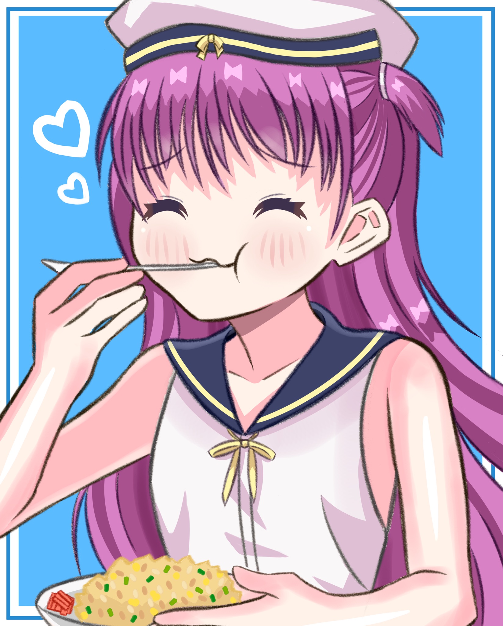1girl :t ^_^ blue_background blue_sailor_collar blush border closed_eyes closed_mouth commentary dress eating food fried_rice hair_between_eyes hand_up happy hat heart highres holding holding_food katou_umi long_hair outside_border pink_hair sailor_collar sailor_dress sailor_hat shake_(pixiv_75845198) simple_background sleeveless sleeveless_dress solo summer_pockets two_side_up utensil_in_mouth very_long_hair wavy_mouth white_border white_dress white_hat