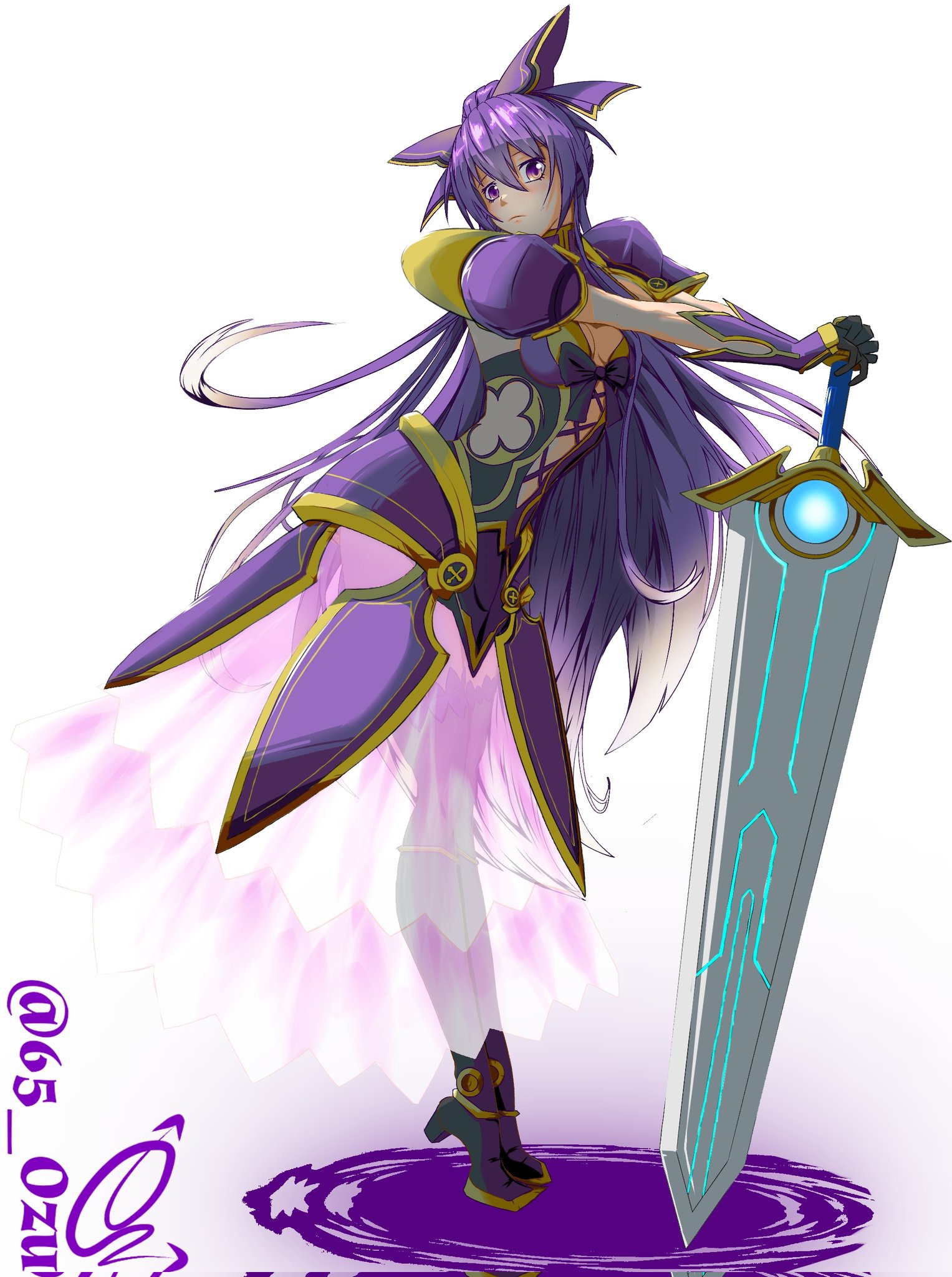 1girl 65ozu armor armored_dress armored_gloves date_a_live dress highres long_hair purple_eyes purple_hair solo sword weapon yatogami_tohka