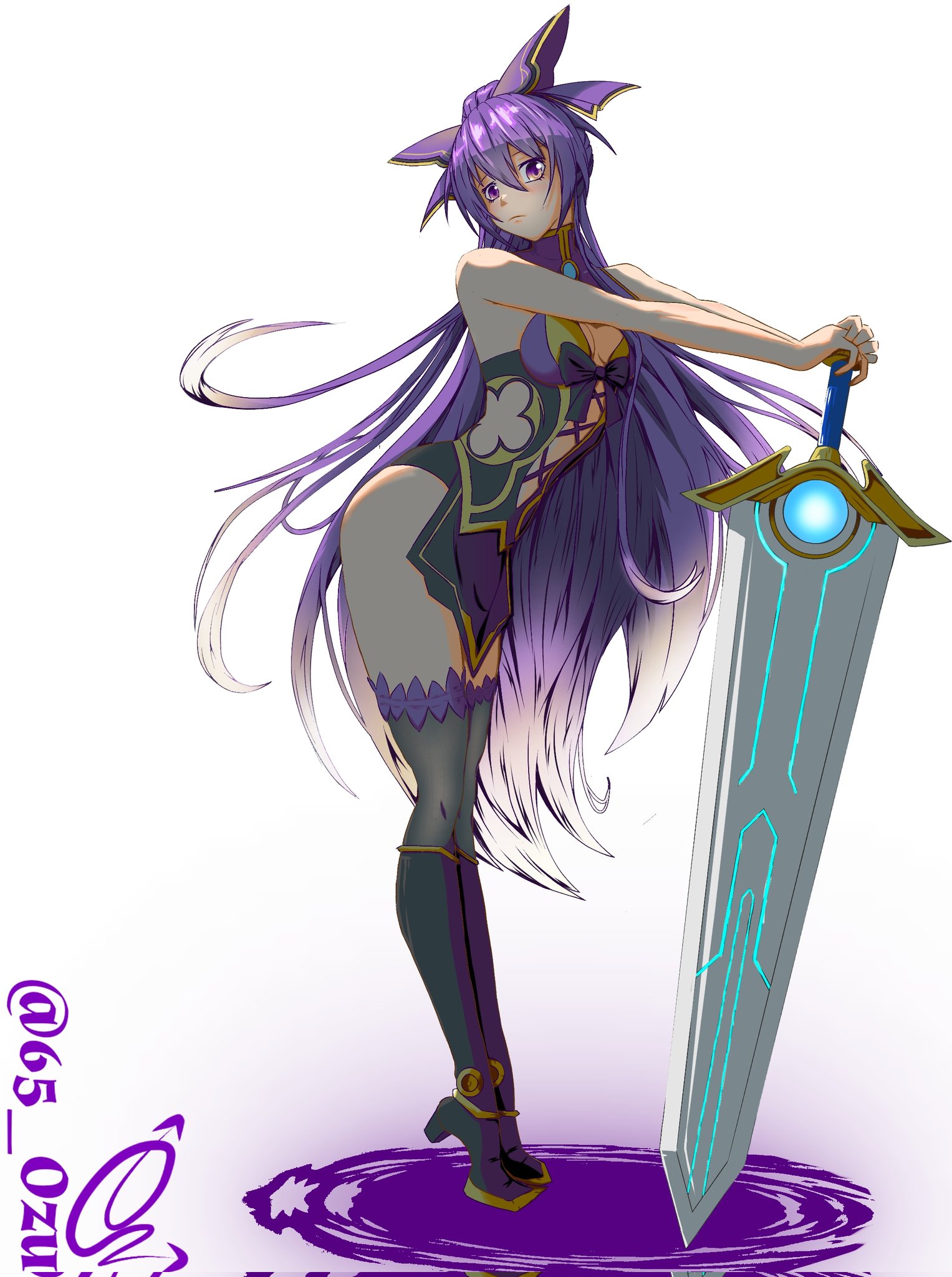 1girl 65ozu ass boots date_a_live highres lingerie long_hair purple_eyes purple_hair socks solo sword underwear weapon yatogami_tohka
