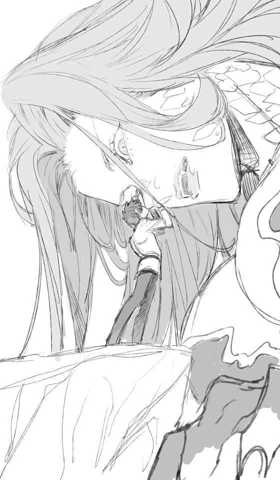 breasts cleavage cliff fangs fate/grand_order fate_(series) fujimaru_ritsuka_(male) full_body giant giantess gorgon_(fate) greyscale kisaragi_kokoro_(hazuki) looking_at_another looking_down looking_up medusa_(fate) monochrome rider scales sketch slit_pupils standing white_background