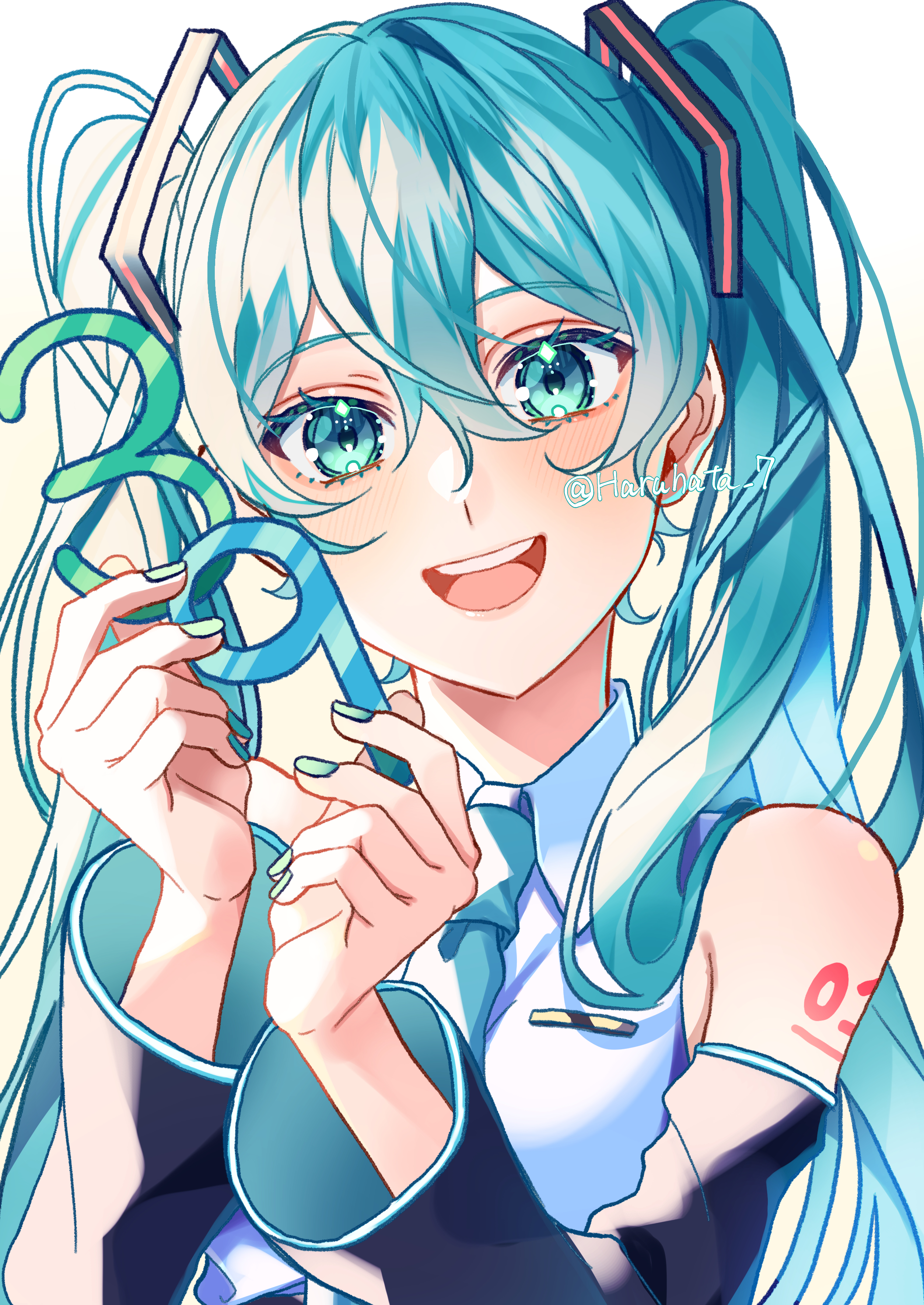 1girl 39 :d absurdres aqua_hair aqua_nails aqua_necktie bare_shoulders black_sleeves blue_hair blue_necktie blush collared_shirt detached_sleeves hair_between_eyes hair_ornament haruhata_7 hatsune_miku highres holding long_hair long_sleeves looking_at_viewer nail_polish necktie open_mouth shirt simple_background sleeveless sleeveless_shirt smile solo tattoo twintails twitter_username upper_body very_long_hair vocaloid white_background white_shirt
