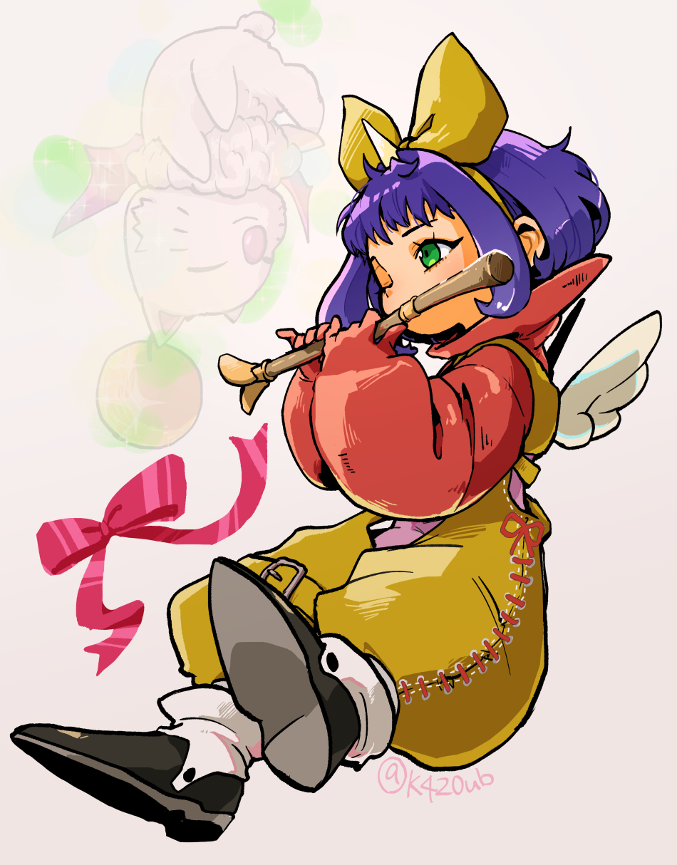 1girl bodysuit boots bow eiko_carol final_fantasy final_fantasy_ix floating flute green_eyes hair_bow hanimitsu_(bisko) highres horns instrument mini_wings moogle music one_eye_closed overalls pink_bodysuit pink_bow pink_sweater playing_flute playing_instrument purple_hair short_hair single_horn solo sweater twitter_username wings yellow_bow yellow_overalls