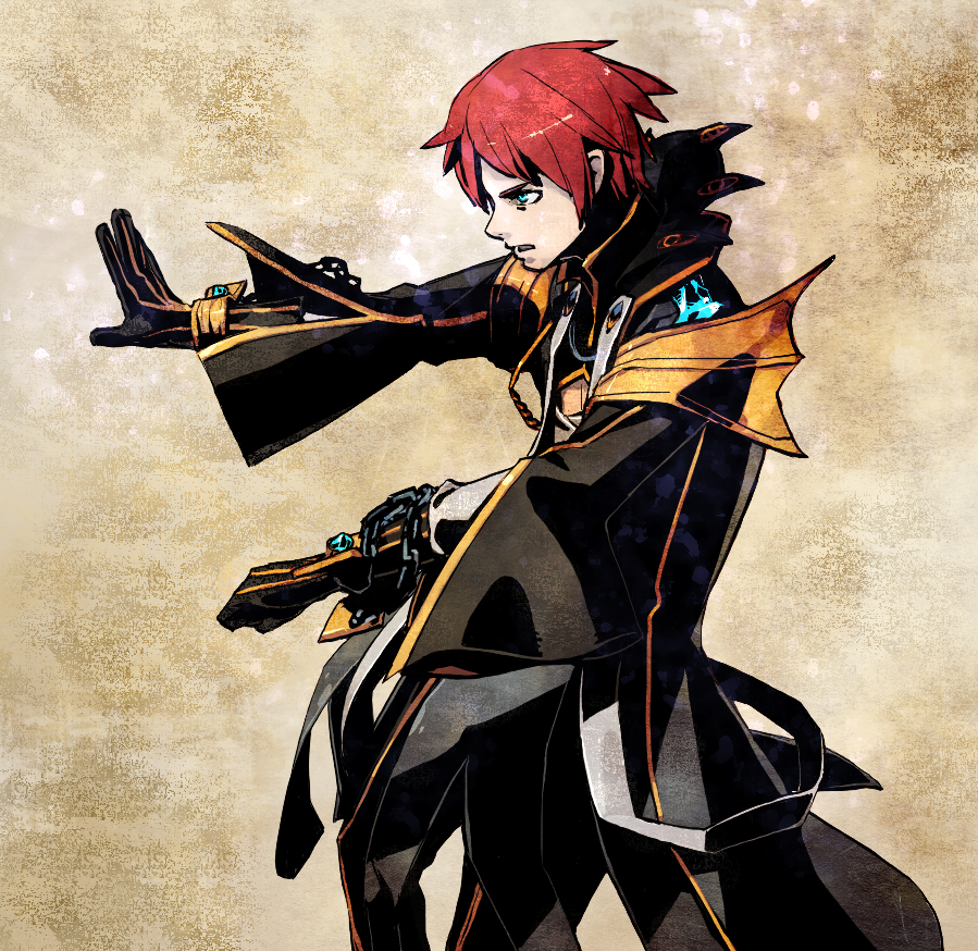 1boy black_coat black_gloves black_pants blue_eyes brown_background chain coat commentary_request cowboy_shot fighting_stance gloves looking_afar male_focus open_mouth pants ragnarok_online red_hair shihou_(g-o-s) shirt short_hair solo warlock_(ragnarok_online) white_shirt