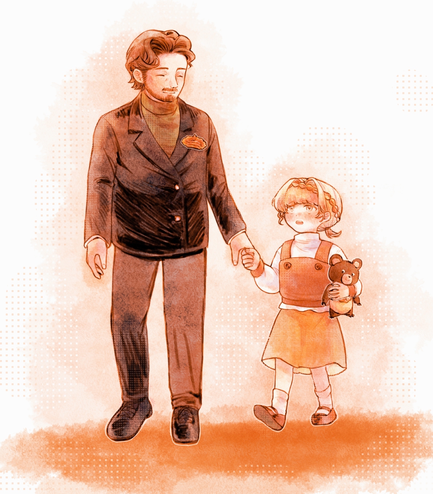 1boy 1girl :o aged_down beard black_jacket black_pants black_shoes blonde_hair braid braided_bangs ciaosalut closed_eyes facial_hair facing_another highres holding_hands holding_stuffed_toy jacket kiperina kozlov_(reverse:1999) looking_at_another low_ponytail misha_(mascot) mustache orange_theme overall_skirt pants ponytail red_shoes red_skirt reverse:1999 shirt shoes short_ponytail skirt socks stuffed_animal stuffed_toy teddy_bear walking white_background white_shirt white_socks