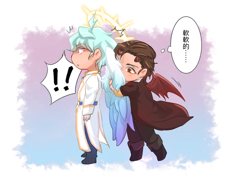 ! !! 2boys angel_wings blue_hair blue_pants boots border brown_eyes brown_hair brown_jacket brown_pants chibi closed_mouth demon_horns demon_wings horns hug huge_wings jacket javier_asrahan kizune159753 korean_commentary lloyd_frontera long_hair long_sleeves looking_at_another multiple_boys pants rainbow_background serious speech_bubble the_greatest_estate_developer thought_bubble white_border white_eyes white_jacket wings