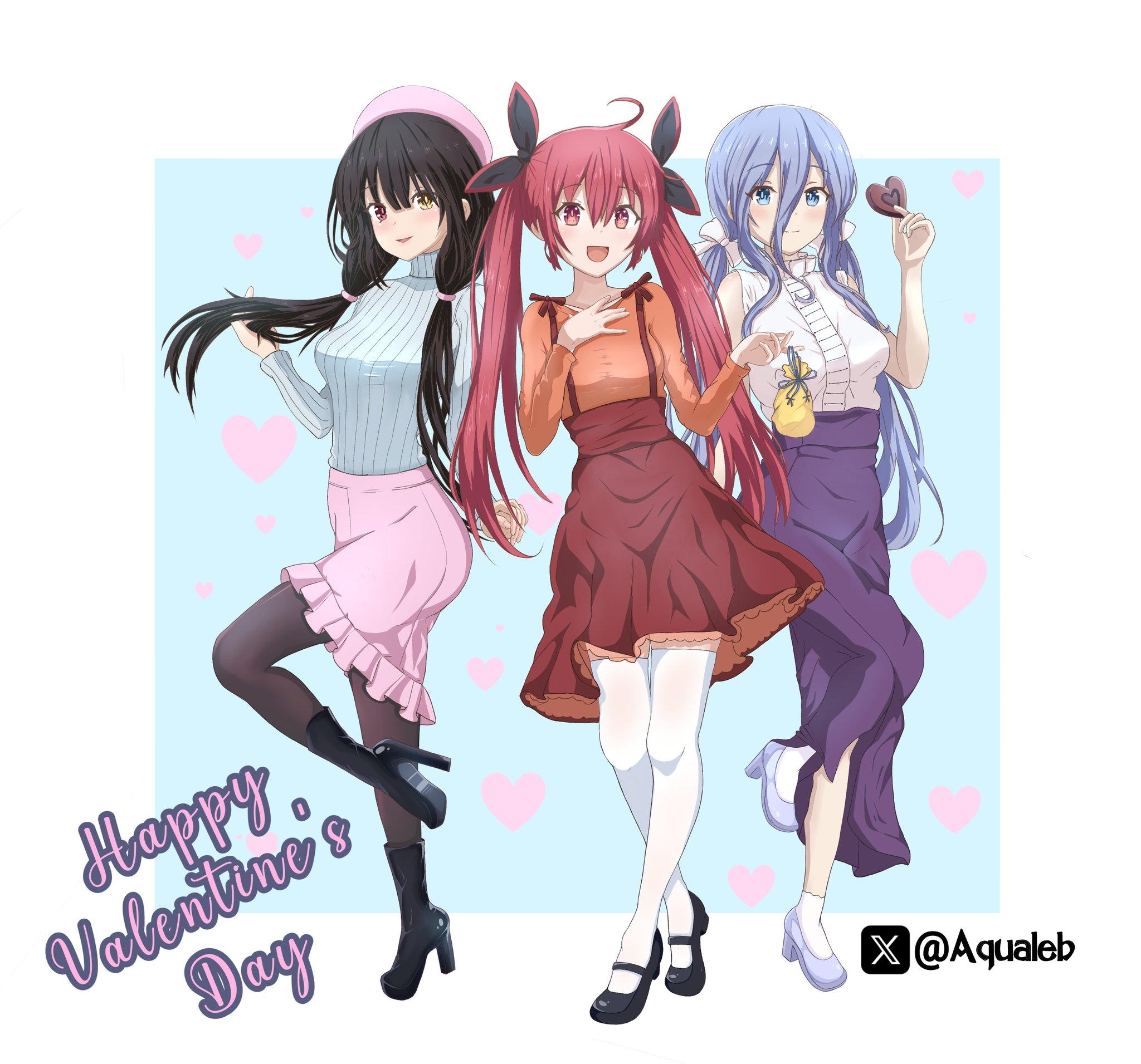 3girls aqualeb black_hair blue_eyes date_a_live english_text female_focus hat high_heels highres itsuka_kotori long_hair multiple_girls red_eyes red_hair skirt takamiya_mio tokisaki_kurumi twintails white_hair