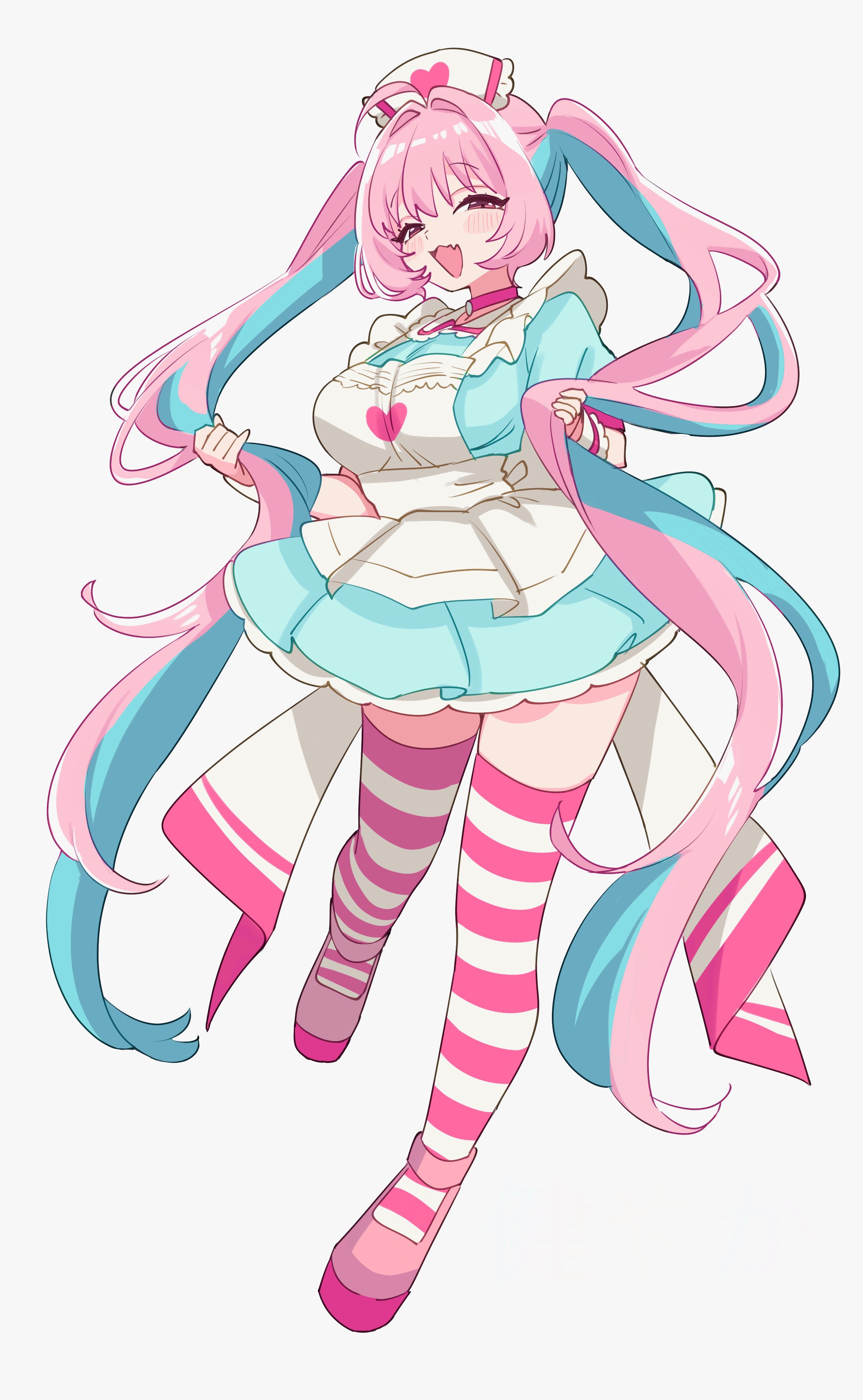 1girl absurdres ahoge alternate_hair_length alternate_hairstyle apron blue_dress blue_hair breasts commentary dress fang full_body hair_intakes half-closed_eyes hat heart heart_print highres idolmaster idolmaster_cinderella_girls idolmaster_cinderella_girls_starlight_stage large_breasts long_hair looking_at_viewer multicolored_thighhighs nurse_cap official_alternate_costume open_mouth pink_hair pink_shoes pink_thighhighs puffy_short_sleeves puffy_sleeves shoes short_sleeves simple_background skin_fang solo sukoyaka_(100hituzi) thighhighs twintails two-tone_thighhighs very_long_hair white_apron white_thighhighs yumemi_riamu