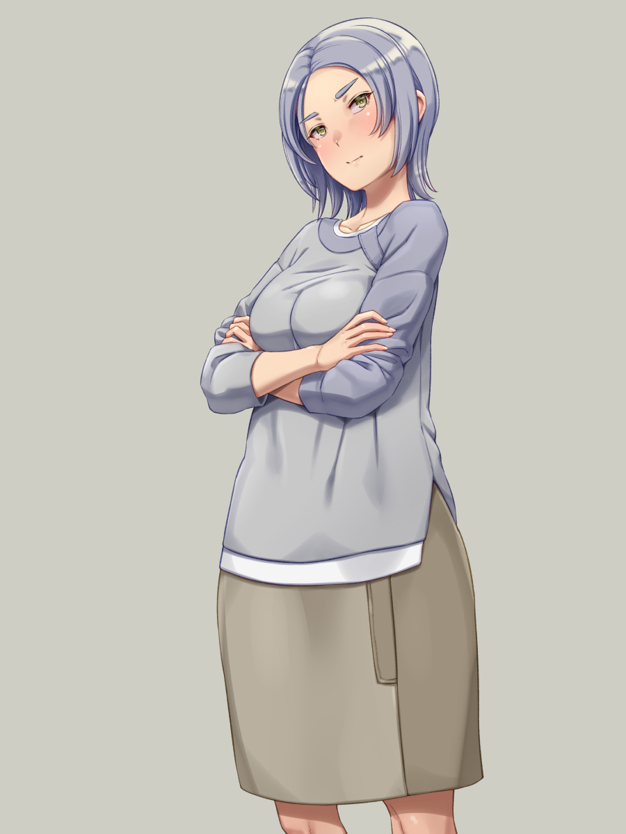 1girl blue_hair blush breasts closed_mouth collarbone cowboy_shot crossed_arms forehead grey_background highres looking_at_viewer original shikuta_maru short_hair simple_background skirt sweater yellow_eyes