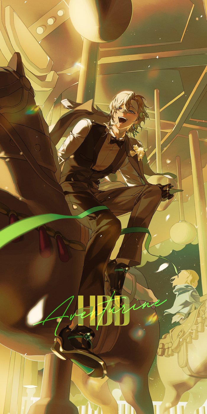 1boy alternate_costume aventurine_(honkai:_star_rail) black_pants black_vest carousel character_name collared_shirt commentary_request dr_suckdu dress_shirt earrings hair_between_eyes highres honkai:_star_rail honkai_(series) horse horseback_riding jewelry korean_commentary male_focus multicolored_eyes open_mouth pants riding shirt shirt_tucked_in short_hair sitting solo_focus vest white_shirt