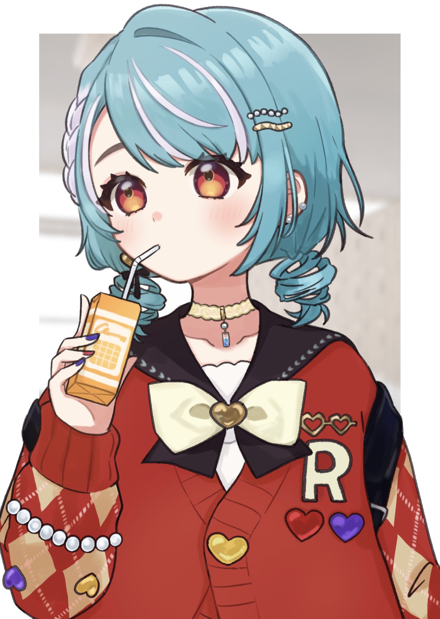 1girl blue_hair blush border braid cardigan choker drink_carton drinking_straw highres holding holding_juice_box juice_box multicolored_hair multicolored_nails orange_eyes outside_border purple_nails red_cardigan red_nails shiranami_ramune shiranami_ramune_(2nd_costume) solo streaked_hair two-tone_hair two-tone_nails unimaru_go virtual_youtuber vspo! white_border white_hair