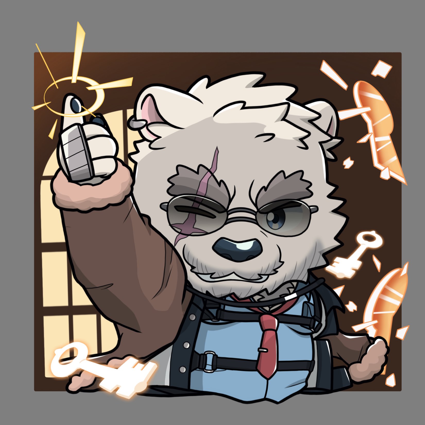 1boy animal_ears another_eidos-r bear bear_boy bear_ears beard blue_shirt brass_knuckles brown_coat chibi chibi_only coat commentary cross_scar earrings english_commentary facial_hair furry furry_male glasses highres index_finger_raised jewelry key keyhole looking_to_the_side muscular muscular_male necktie official_alternate_costume one_eye_closed pawpads polar_bear red_necktie scar scar_across_eye scar_on_face shirt sigvaldi_(another_eidos) strap weapon white_fur yojanmarrion