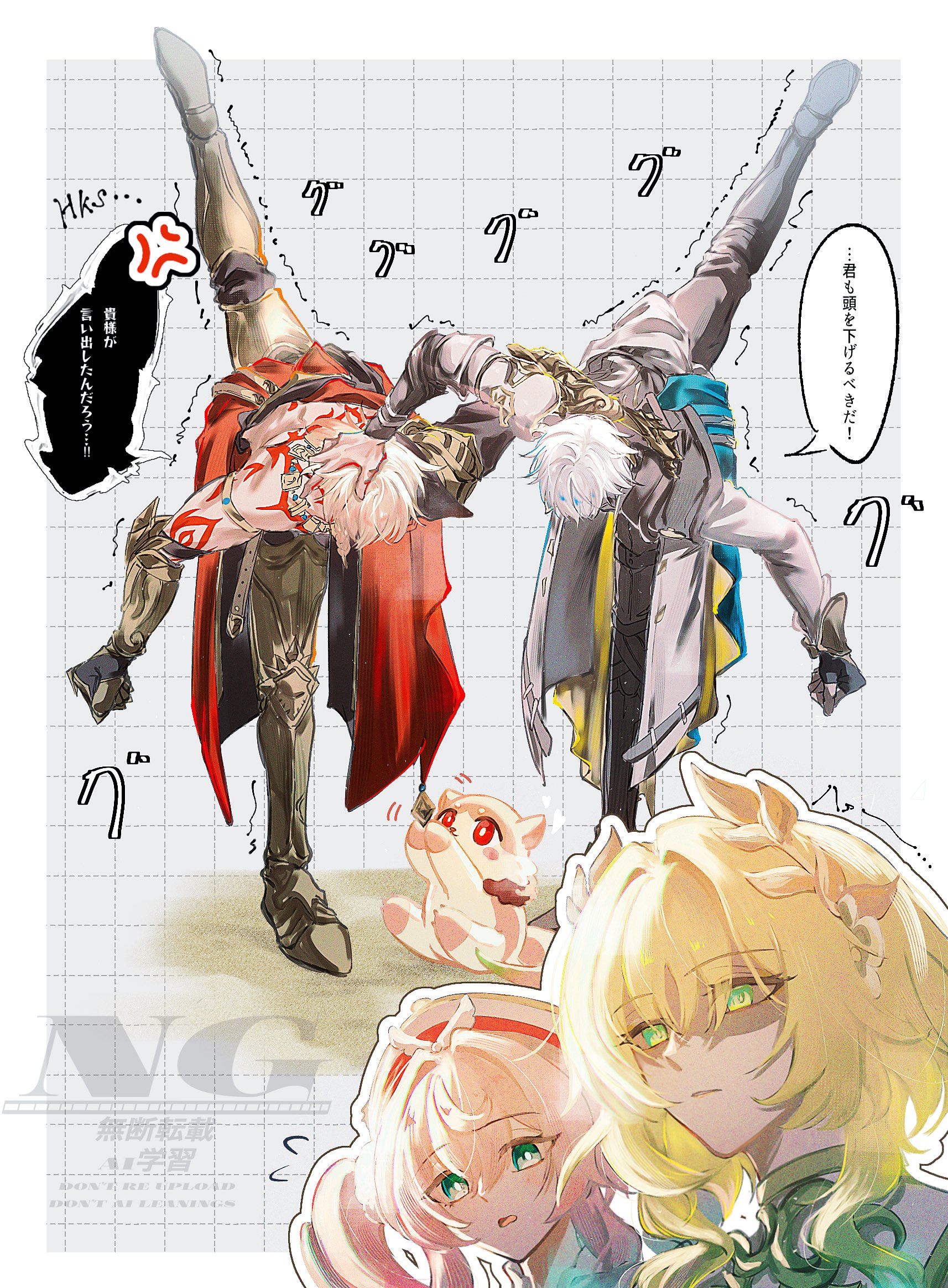 2boys 2girls aglaea_(honkai:_star_rail) aqua_eyes armor black_gloves blonde_hair body_markings drill_hair gloves green_eyes hand_on_another's_head hat highres honkai:_star_rail honkai_(series) hyacine_(honkai:_star_rail) laurel_crown leg_armor multiple_boys multiple_girls mydei_(honkai:_star_rail) partially_shaded_face phainon_(honkai:_star_rail) pink_hair short_hair speech_bubble standing standing_on_one_leg translation_request ukisi vambraces watermark white_hair