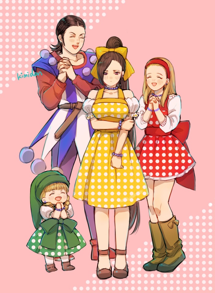 1boy 3girls alternate_costume androgynous artist_name bare_shoulders bead_bracelet bead_necklace beads blonde_hair boots bow bracelet braid breasts brown_boots brown_shoes closed_eyes collarbone commentary_request dirndl dragon_quest dragon_quest_xi dress dress_bow earrings full_body german_clothes green_bow green_dress green_hat hair_bow hair_pulled_back hairband hand_on_own_elbow hands_clasped_in_delight hat high_ponytail jewelry kimidori_(kimidoriri) large_breasts long_hair looking_down low_twin_braids martina_(dq11) medium_hair multiple_girls necklace off_shoulder official_alternate_costume open_mouth own_hands_clasped own_hands_together parted_hair pink_background polka_dot polka_dot_dress ponytail puffy_short_sleeves puffy_sleeves purple_eyes purple_hair red_bow red_dress red_hairband red_shirt senya_(dq11) shirt shirt_under_dress shoes short_sleeves shy siblings sisters smile striped_clothes stud_earrings sylvia_(dq11) tunic twin_braids twins veronica_(dq11) waist_bow white_shirt yellow_bow yellow_dress