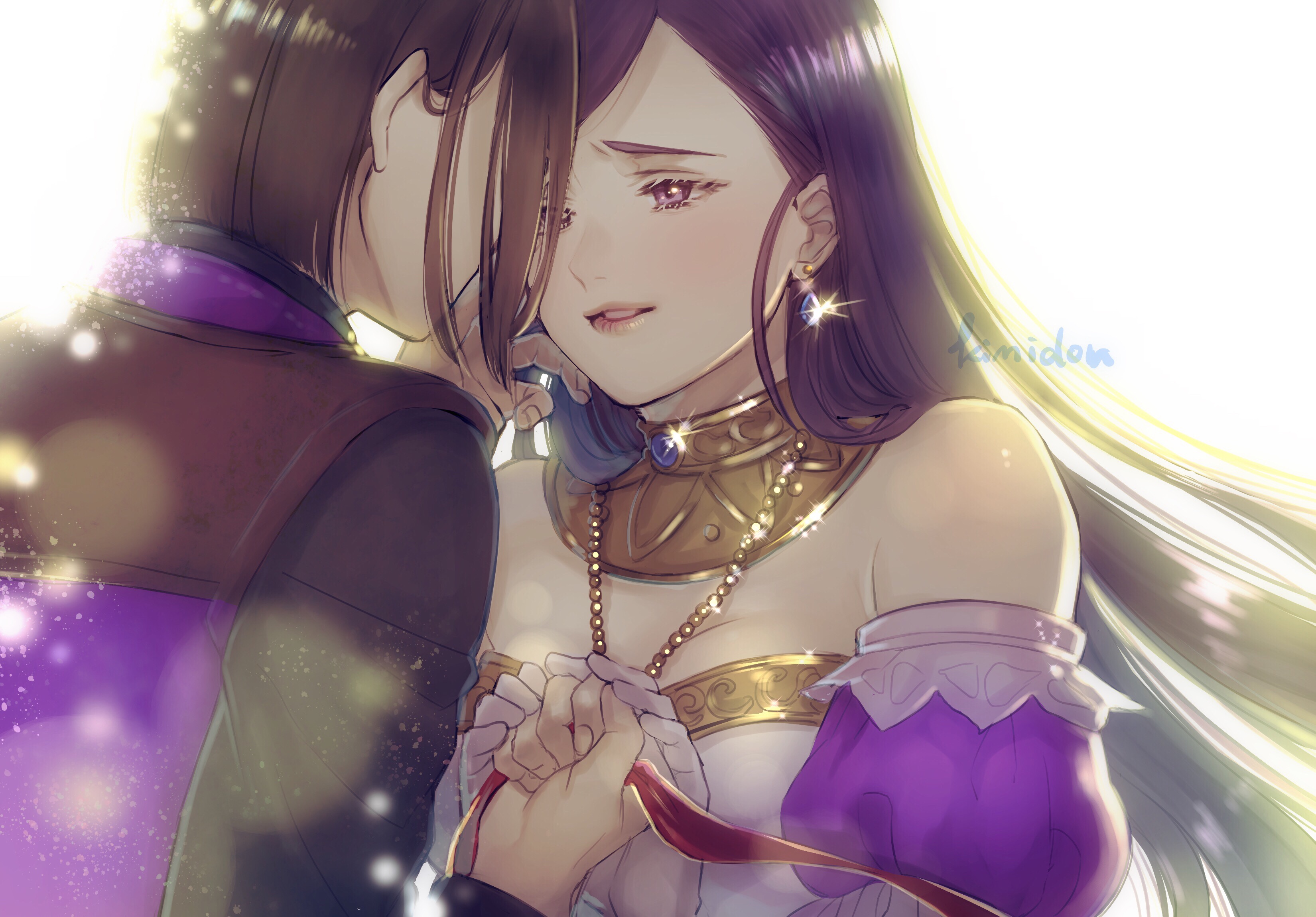 1girl absurdres bare_shoulders black_shirt blue_gem blunt_ends breasts brown_hair cleavage commentary_request couple detached_sleeves dragon_quest dragon_quest_xi dress earrings facing_away floating_hair forehead-to-forehead gem gloves gold_necklace gold_trim hair_down hand_in_another's_hair hands_on_another's_hand heads_together hero_(dq11) hetero highres holding holding_ribbon jewelry kimidori_(kimidoriri) light_particles long_hair looking_at_another martina_(dq11) medium_hair necklace official_alternate_costume parted_lips princess puffy_sleeves purple_eyes purple_hair purple_tunic red_ribbon ribbon shirt strapless strapless_dress tunic upper_body white_background white_dress white_gloves