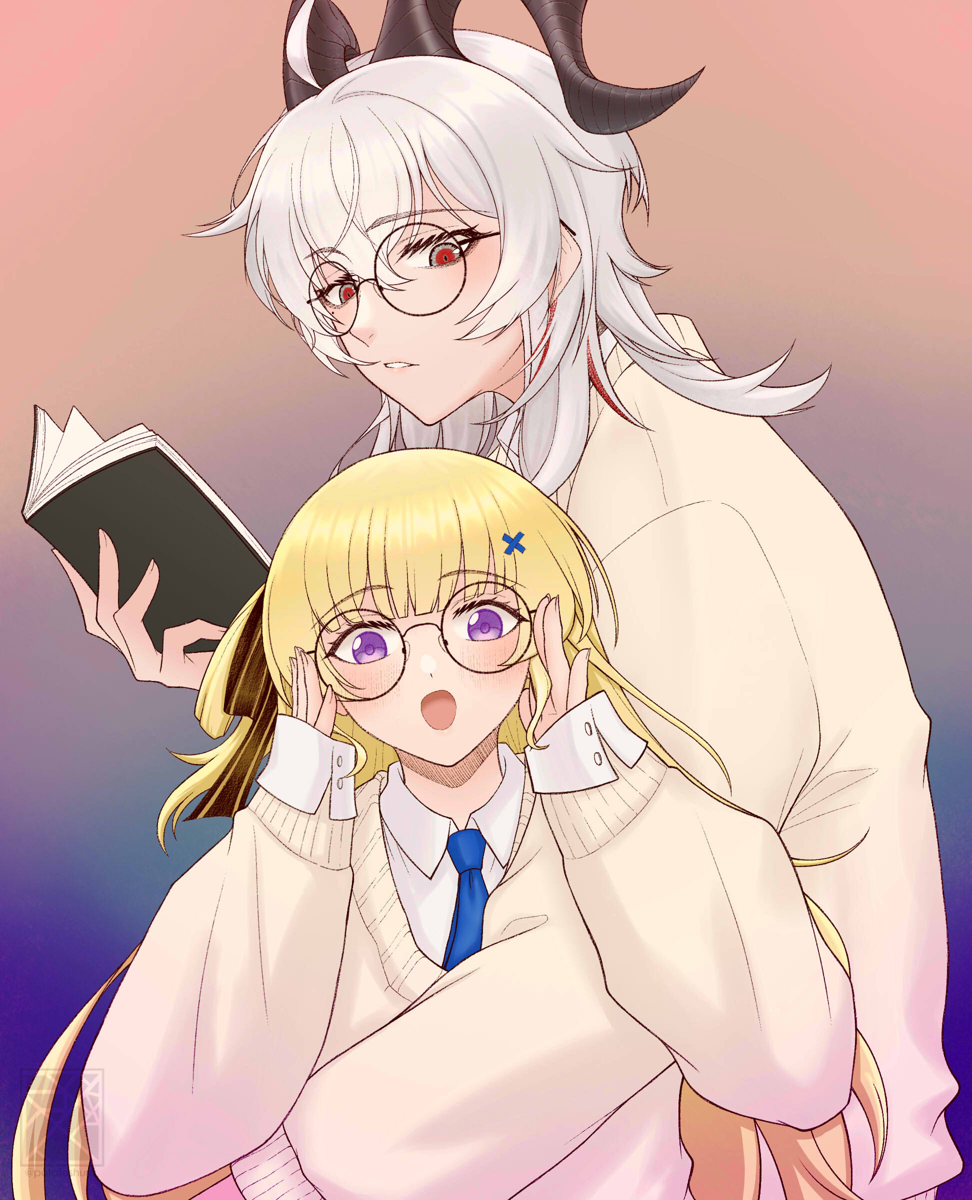 2girls absurdres adjusting_eyewear alternate_costume bespectacled black_bow black_horns blonde_hair blue_necktie book bow collared_shirt commentary curled_horns glasses gradient_background hair_bow hair_ornament hashtag-only_commentary highres holding holding_book horns light_blush long_hair multicolored_hair multiple_girls necktie open_mouth parted_lips phoebe_(wuthering_waves) potatoshura purple_eyes red_eyes shirt streaked_hair white_hair white_shirt wuthering_waves x_hair_ornament zani_(wuthering_waves)