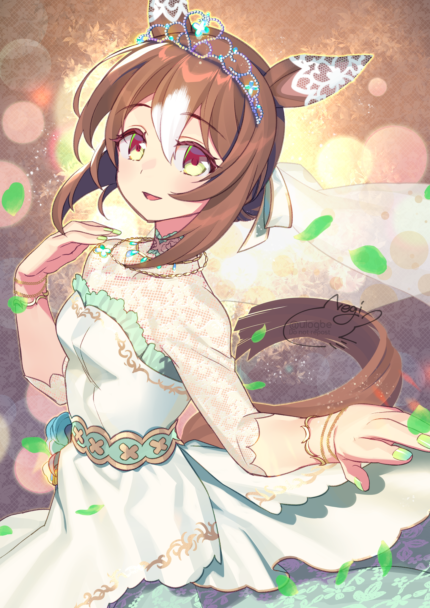 1girl alternate_costume animal_ears artist_name blush bracelet bridal_veil bride brown_hair commentary commentary_request dress ear_covers english_commentary fine_motion_(titania)_(umamusume) fine_motion_(umamusume) folded_ponytail green_dress green_eyes green_nails hair_between_eyes hair_ornament highres horse_ears horse_girl horse_tail jewelry lace lace_shirt lace_sleeves long_dress looking_at_viewer multicolored_hair nail_polish necklace negi_(ulog'be) offering_hand official_alternate_costume open_mouth petals short_hair short_sleeves signature smile solo standing tail three-quarter_sleeves tiara umamusume veil wedding_dress white_dress white_hair