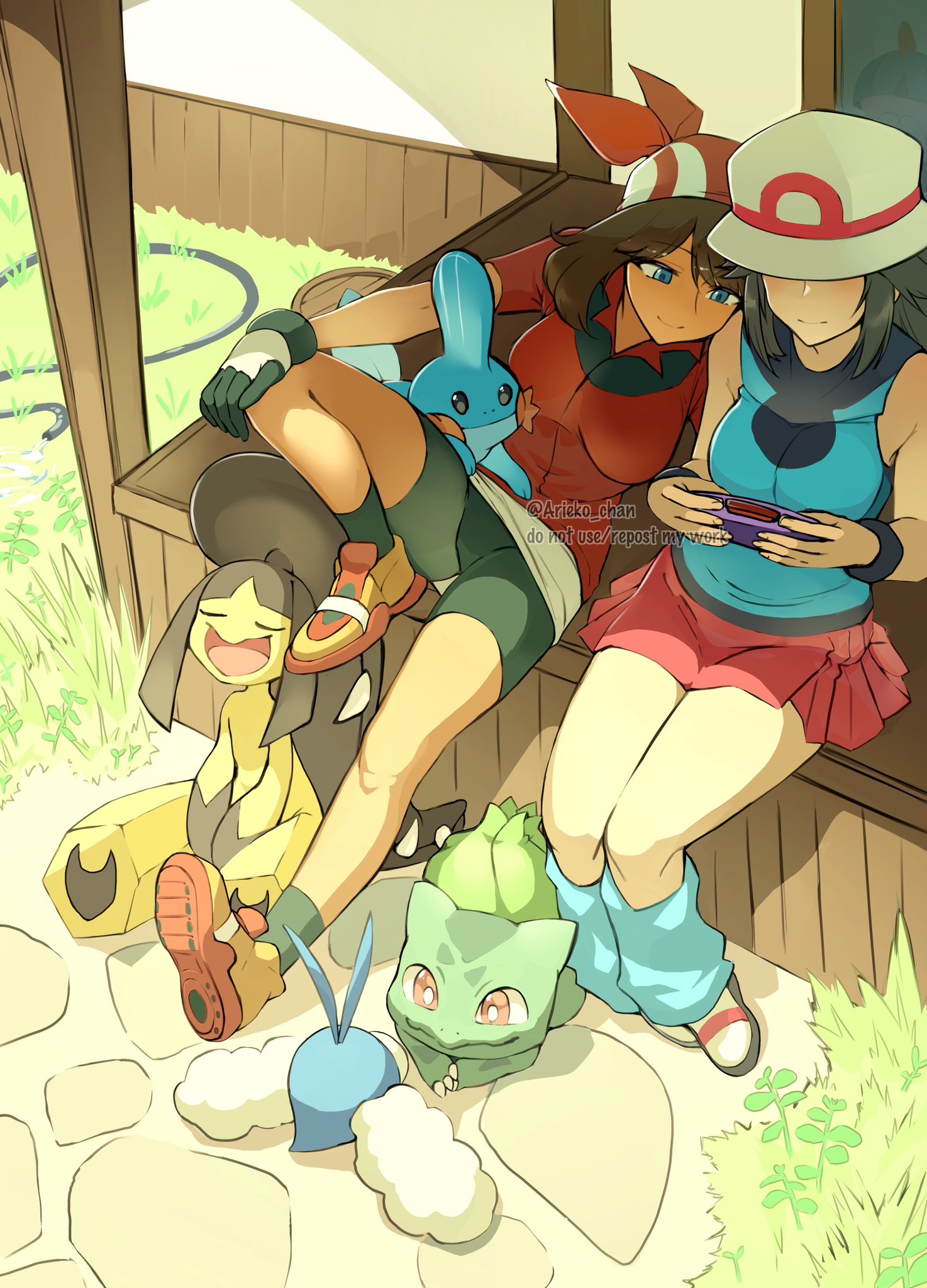 2girls ariekochan bandana bike_shorts black_shorts black_socks blue_eyes blue_shirt blue_socks brown_hair bulbasaur closed_mouth game_boy_advance game_boy_advance_(original) gen_1_pokemon gen_3_pokemon gloves handheld_game_console hat highres holding holding_handheld_game_console hose leaf_(pokemon) mawile may_(pokemon) mudkip multiple_girls nintendo pokemon pokemon_(creature) pokemon_firered_and_leafgreen pokemon_ruby/sapphire/emerald ralts red_bandana red_shirt red_skirt shirt shoes short_sleeves shorts side-by-side sitting skirt sleeveless sleeveless_shirt socks swablu white_hat wristband