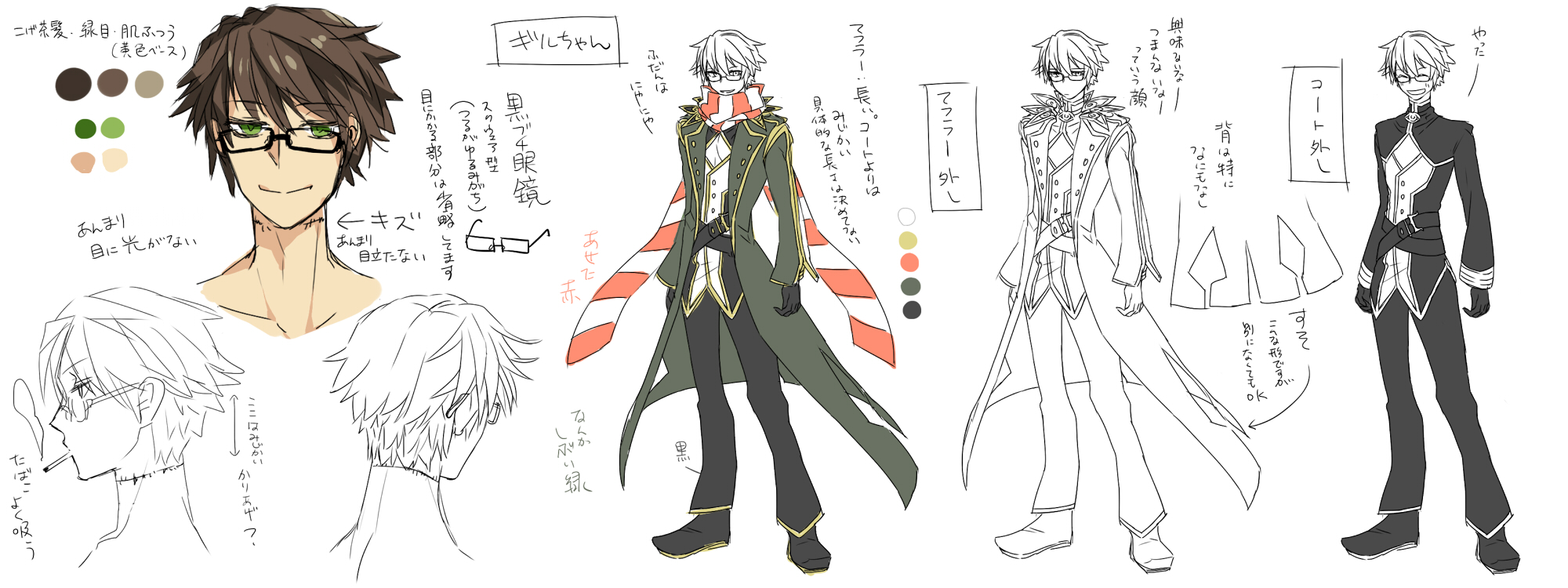 1boy black-framed_eyewear black_gloves black_pants black_shirt black_shoes brown_hair cigarette closed_mouth coat color_guide commentary_request full_body glasses gloves green_eyes grey_coat highres looking_at_viewer male_focus open_clothes open_coat pants ragnarok_online red_scarf scarf shirt shoes short_hair simple_background smile standing striped_clothes striped_scarf tokiwa_tsuneba translation_request two-tone_shirt warlock_(ragnarok_online) white_background white_scarf white_shirt