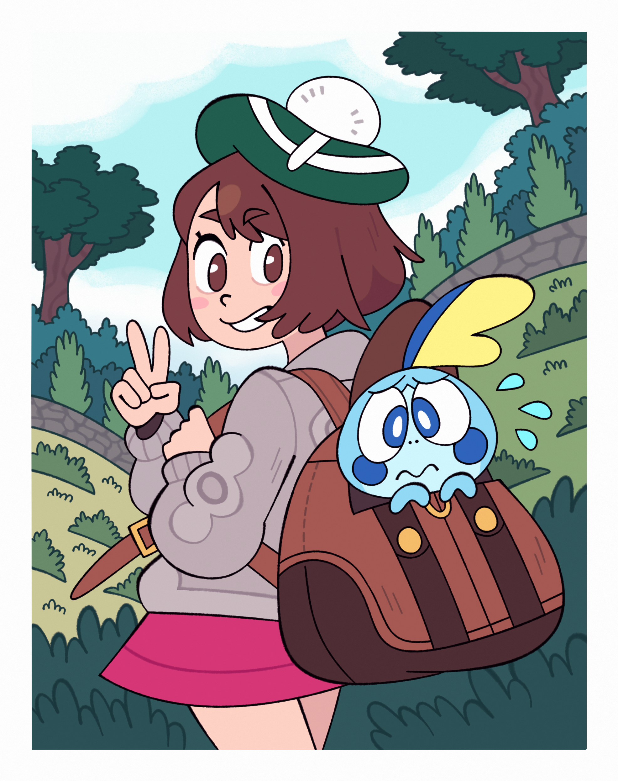 1girl absurdres bag billspooks blush_stickers bob_cut brown_hair cardigan cowboy_shot dress flying_sweatdrops forest gen_8_pokemon gloria_(pokemon) green_hat grey_cardigan grin hand_up hat highres in_bag in_container looking_at_viewer looking_back nature nintendo outdoors pink_dress pink_skirt pokemon pokemon_(creature) pokemon_swsh short_dress short_hair skirt smile sobble tam_o'_shanter toon_(style) tree v