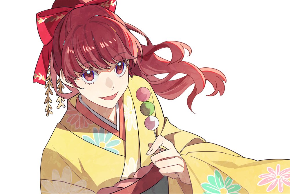 1girl dango food hair_ribbon hashtag-only_commentary holding holding_food japanese_clothes kimono long_hair looking_at_viewer obi official_alternate_costume persona persona_5 persona_5_the_royal ponytail red_eyes red_hair red_ribbon ribbon sash shervy78550897 simple_background solo wagashi white_background yellow_kimono yoshizawa_kasumi