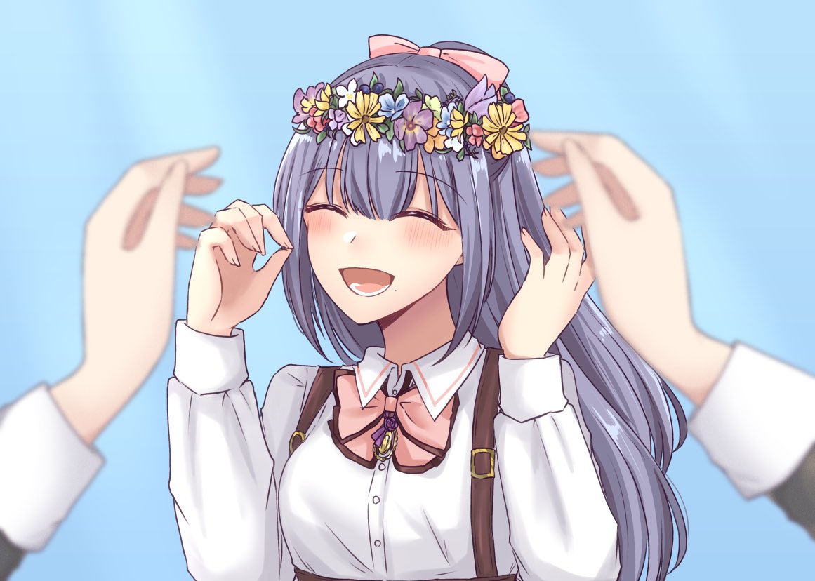 2girls :d ^_^ assault_lily blue_background blue_flower blurry blurry_foreground blush bow buttons closed_eyes collared_shirt commentary facing_viewer female_pov flower flower_wreath fukuyama_jeanne_sachie gradient_background grey_hair hair_bow half_updo hands_up head_wreath jewelry long_hair long_sleeves lower_teeth_only ludvico_private_girls'_academy_school_uniform multiple_girls necklace nigari_(ngari_0115) open_mouth orange_flower pendant pink_bow pov pov_hands purple_flower school_uniform shirt smile solo_focus suspenders teeth underbust upper_body white_flower white_shirt yellow_flower
