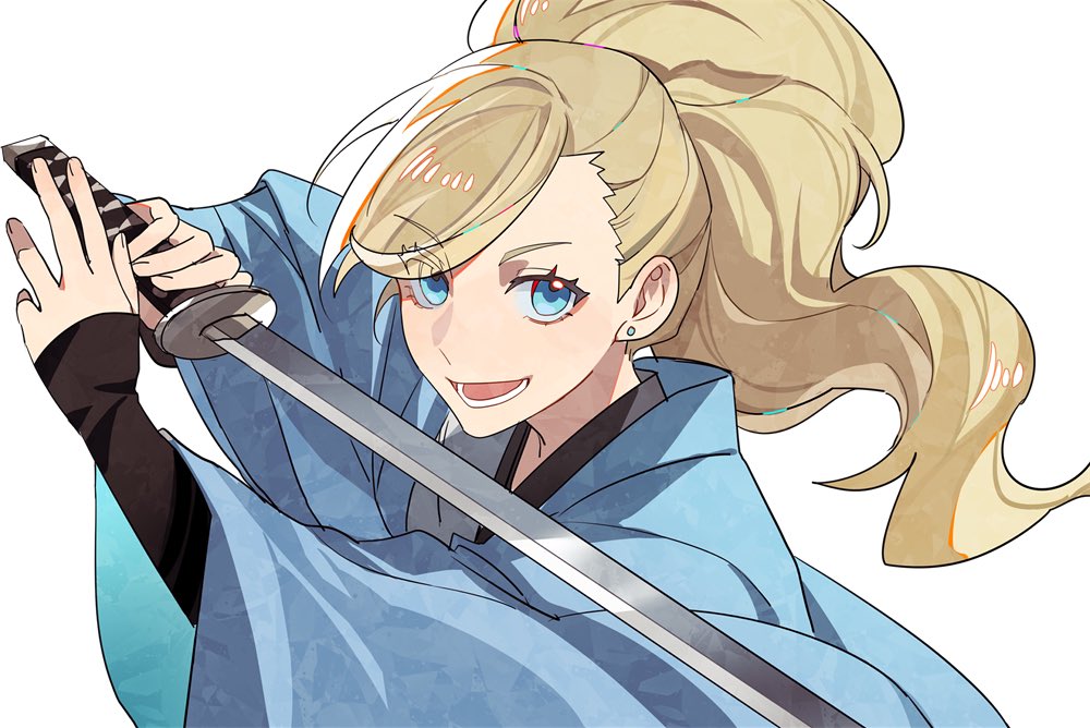 1girl blue_eyes blue_kimono hashtag-only_commentary holding holding_sword holding_weapon japanese_clothes katana kimono long_hair looking_at_viewer lower_teeth_only official_alternate_costume official_alternate_hairstyle open_mouth persona persona_5 persona_5_tactica ponytail shervy78550897 simple_background smile solo sword takamaki_anne teeth wavy_hair weapon white_background wide_sleeves