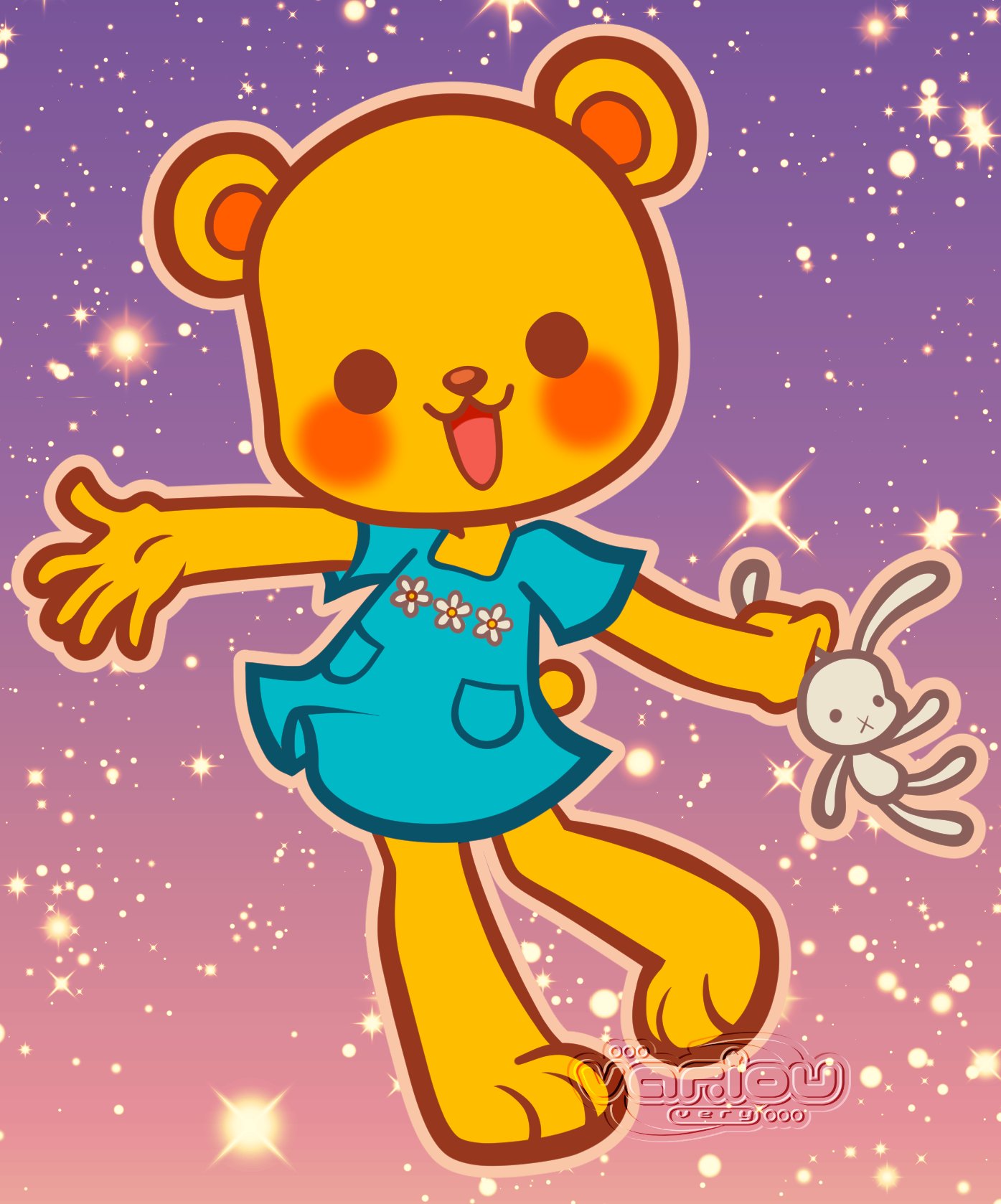 1girl :3 animal_ears animal_feet bear_ears bear_girl blue_dress blush_stickers child commentary cookie's_bustle cookie_blair dress english_commentary floral_print furry furry_female happy highres holding holding_stuffed_toy looking_at_viewer open_mouth solid_circle_eyes solo stuffed_animal stuffed_rabbit stuffed_toy variouvery watermark yellow_fur