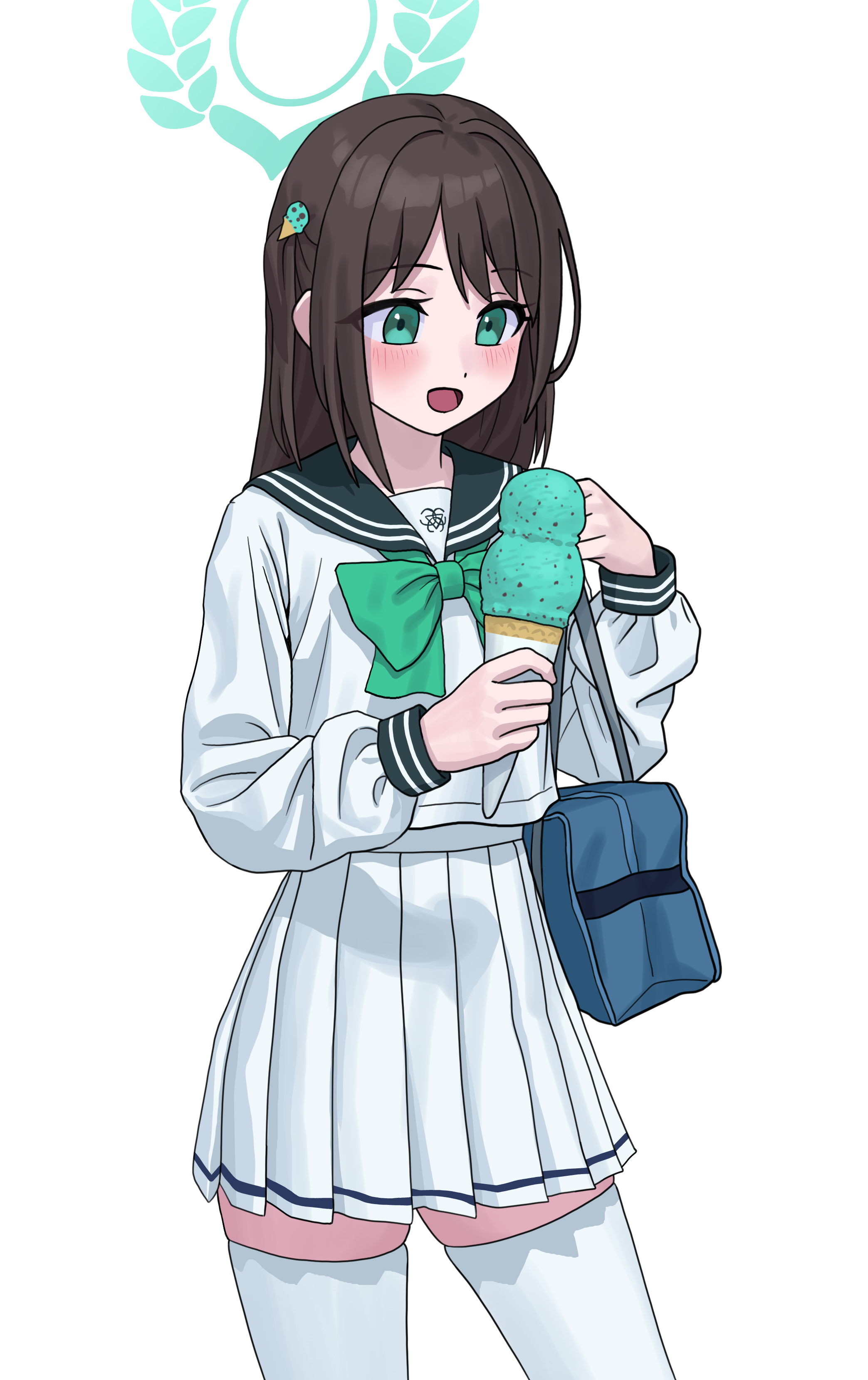 1girl absurdres airi_(blue_archive) bag blue_archive blush bow bowtie brown_hair commentary_request cowboy_shot food food-themed_hair_ornament green_bow green_bowtie hair_ornament halo highres holding holding_food holding_ice_cream_cone ice_cream ice_cream_cone ice_cream_scoop_(utensil) korean_commentary long_hair long_sleeves mint_chocolate multiple_scoops okokorika pleated_skirt school_bag school_uniform serafuku simple_background skirt smile solo straight_hair thighhighs white_background white_serafuku white_thighhighs zettai_ryouiki