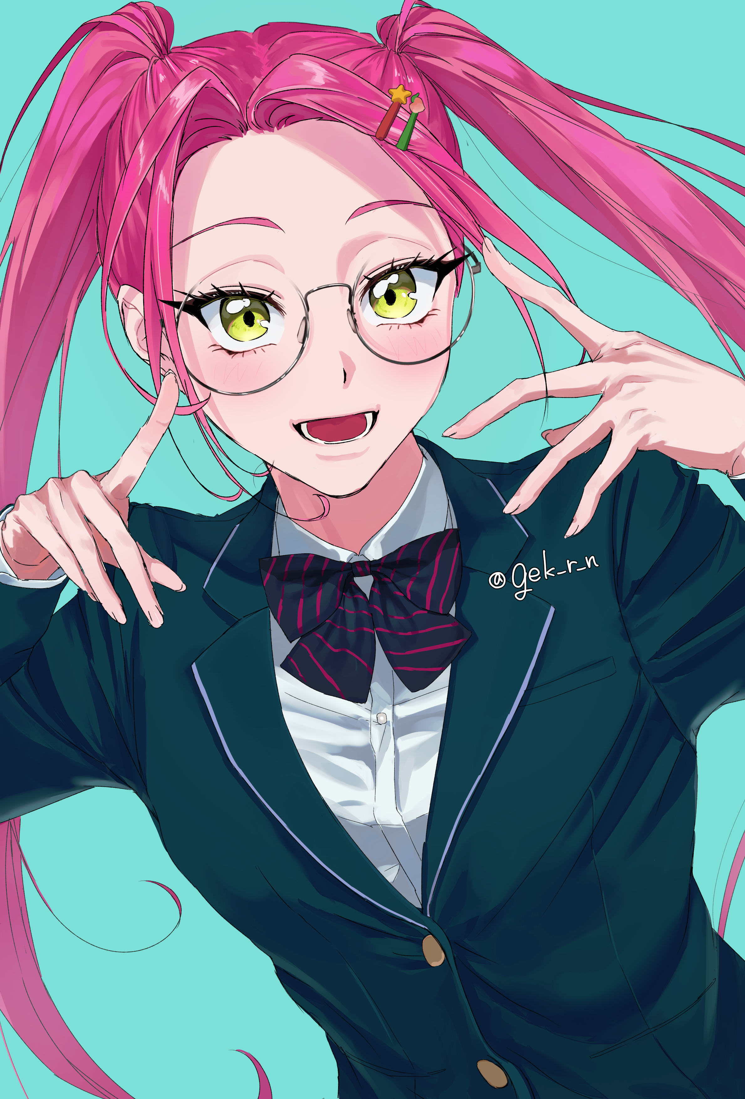 1girl absurdres alien_stage aqua_background artist_name black_bow black_bowtie blazer blue_jacket bow bowtie commentary diagonal-striped_bow diagonal-striped_bowtie diagonal-striped_clothes food-themed_hair_ornament gek_r_n glasses hair_ornament hands_up highres jacket long_hair mizi_(alien_stage) official_alternate_costume open_mouth peach_hair_ornament shirt simple_background smile solo star_(symbol) star_hair_ornament striped_bow striped_bowtie striped_clothes twintails upper_body white_shirt yellow_eyes