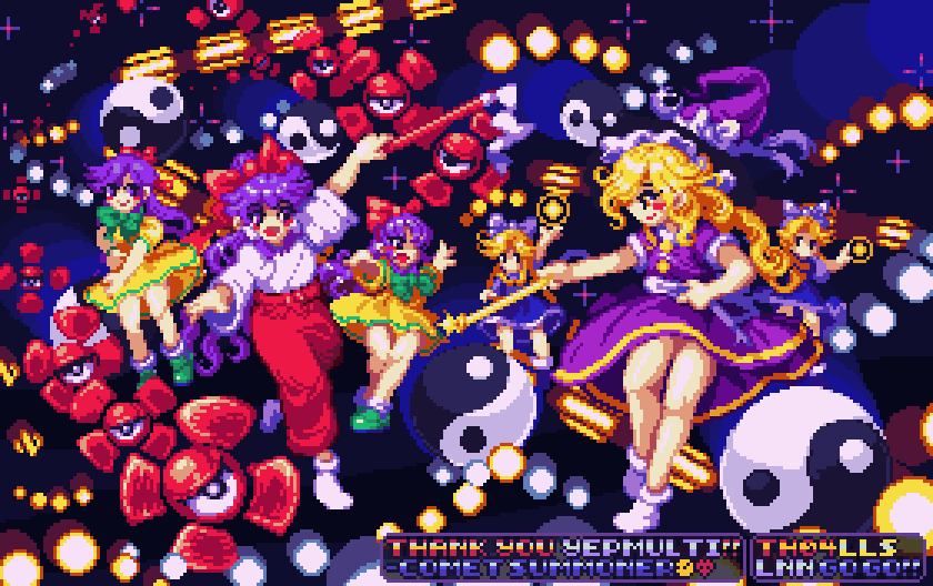 6+girls blonde_hair bow comet_summoner98 commentary commission danmaku dress english_commentary gohei green_bow hair_bow hakurei_reimu hakurei_reimu_(pc-98) hat hat_bow holding holding_gohei japanese_clothes kirisame_marisa kirisame_marisa_(pc-98) lotus_land_story multiple_girls orb pixel_art pixiv_commission purple_bow purple_dress purple_hair red_bow rengeteki_(touhou) touhou touhou_(pc-98) yellow_dress yin_yang yin_yang_orb