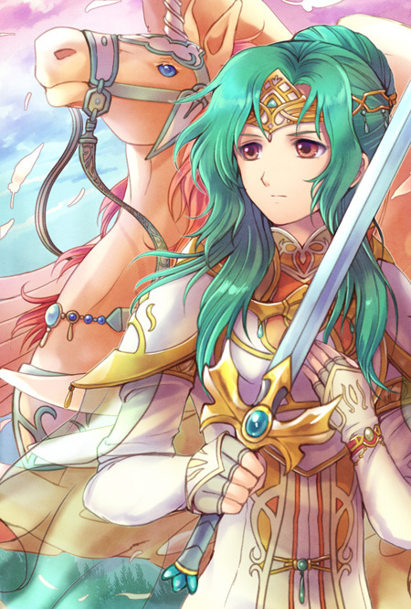 1girl armor brown_eyes elincia_ridell_crimea elincia_ridell_crimea_(undaunted_queen) feathers fire_emblem fire_emblem:_radiant_dawn green_hair hand_on_own_chest holding holding_sword holding_weapon long_hair nemupon_(goodlucky) nintendo pegasus sword weapon